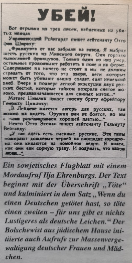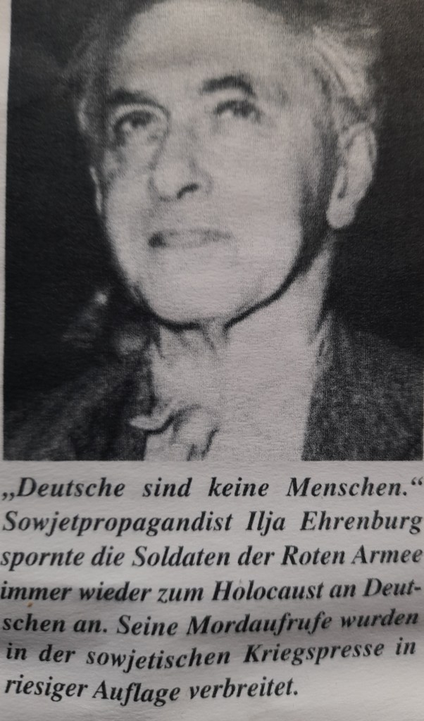 Und in der sowjetischen Soldatenzeitung „Krasnaj Swesdna“ vom 22. Oktober 1944 notierte der Stalin –Propagandist: „Es genügt nicht, die Deutschen nach Westen zu treiben. Die Deutschen müssen ins Grab gejagt werden. Gewiss ist ein geschlagener Fritz besser als ein unverschämter. Von allen Fritzen aber sind die toten am besten.“