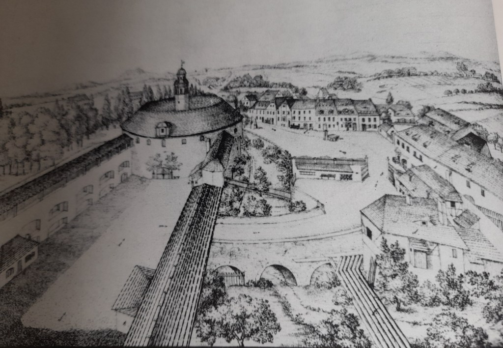 Aufnahmen: Blick vom Reichenbacher Turm auf den Kaisertrutz mit den zwei Zingelmauern, die um 1848 fielen. Nach der Idee Könige Friedrich Wilhelms IV. bekam das nun frei auf dem Platze stehende Bauwerk einen Vorbau mit zwei Türmen und einem Säulentor, statt des Ziegeldaches einen Zinnenkranz und eine Zinnenkrone für das Türmchen. (Zeichnung von F. Thieme, 1841).