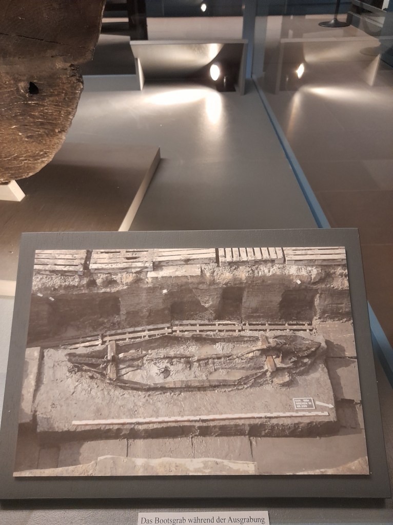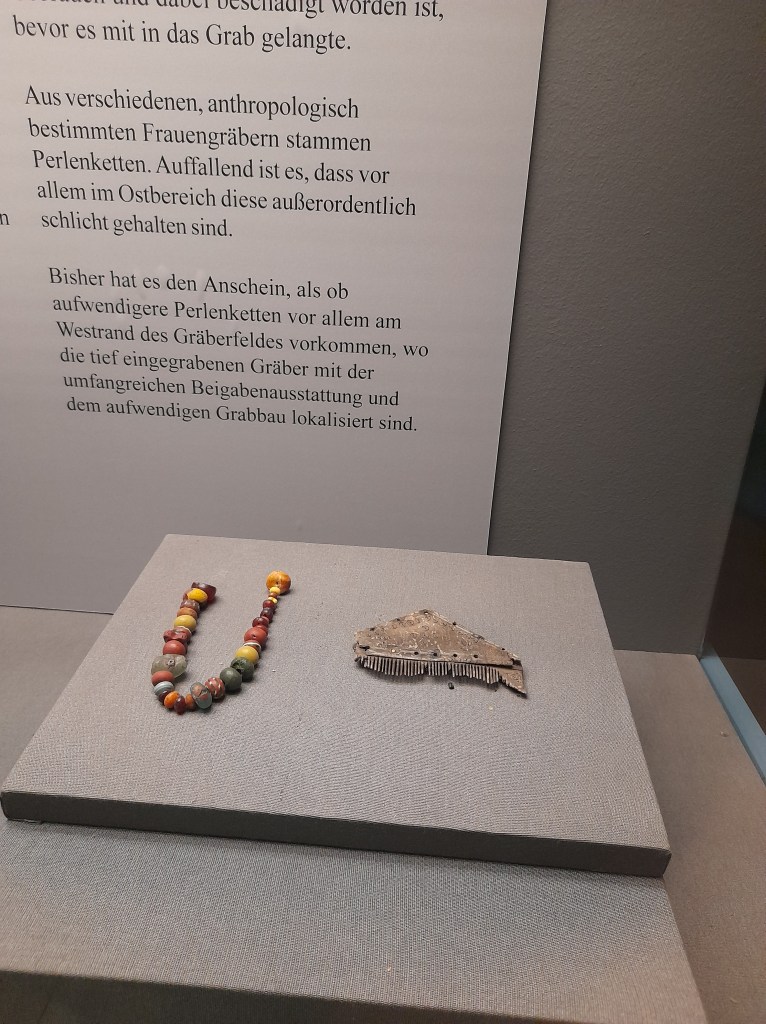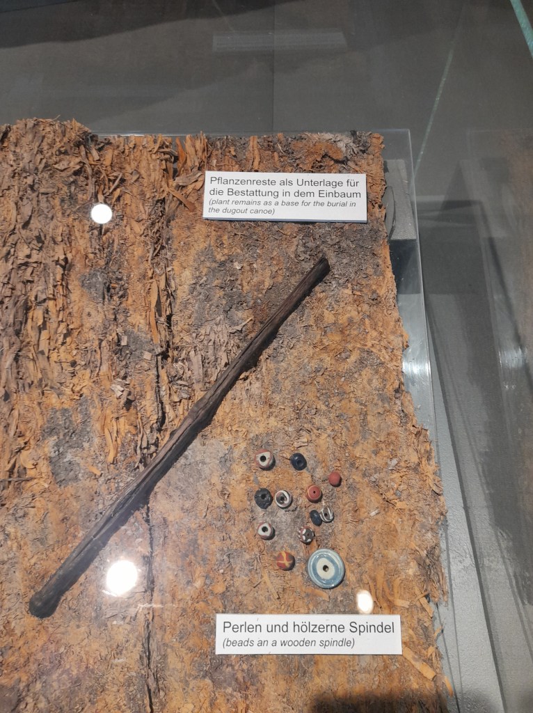 Auf den Bildern seht ihr Teile der Grabausstattungen, wie die eines jungen Mädchens und eines Mannes aus dem 5. Jahrhundert. Das Grab eines Kindes fand man nur wenige Meter von dem Bootsgrab entfernt. Es gehört zu den aufwendig ausgestatteten Gräbern der Fallward. Beigesetzt war das Mädchen in einem gut erhaltenen Sarg.