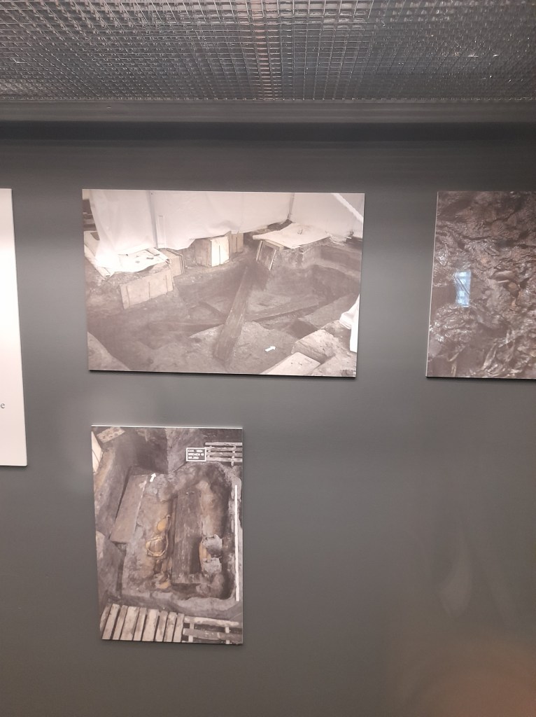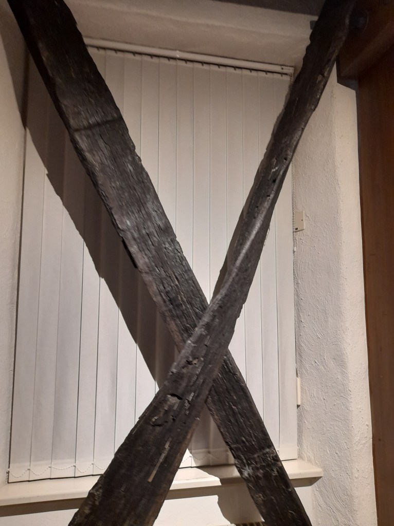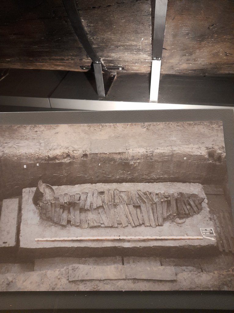Ihr seht auch Spaltbohlen aus dem Mädchengrab. Die Hölzer lagen wie ein Andreaskreuz über der Grabkammer.