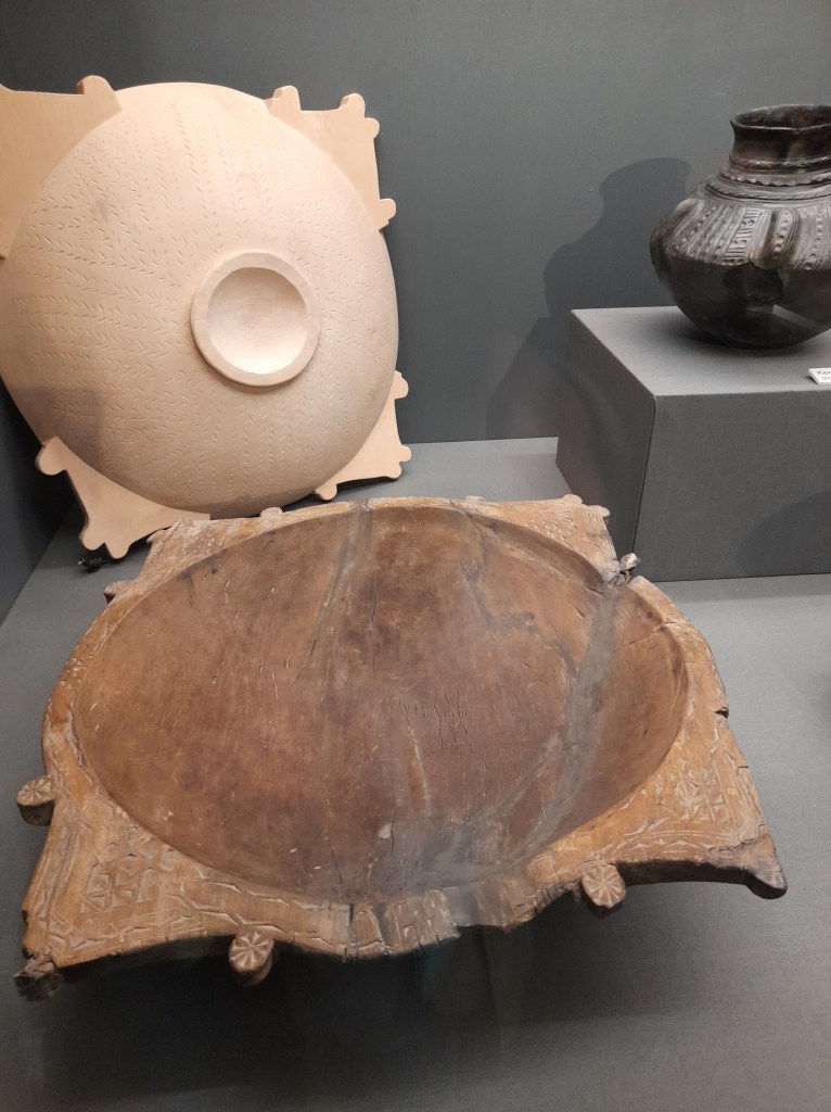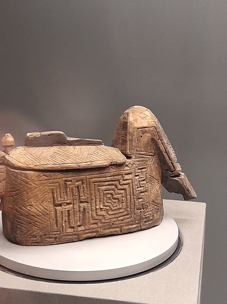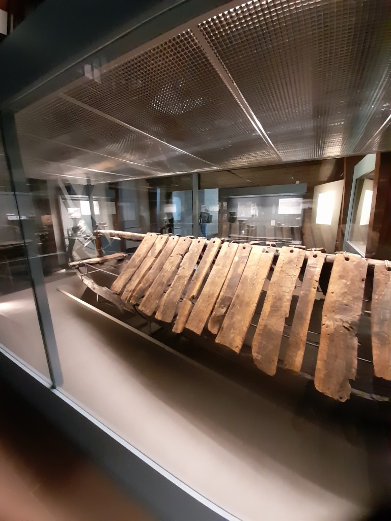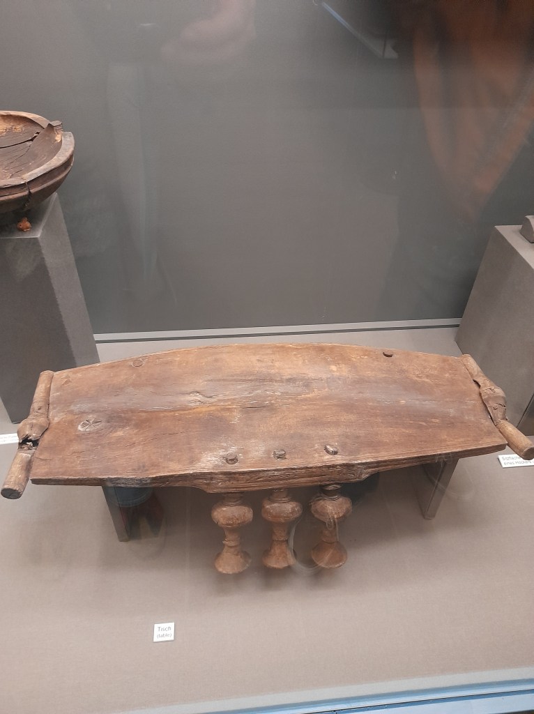 An den Sarg angelehnt fand sich der kleine Hocker, der aus einem Baumstamm gefertigt ist. Die habkreisförmigen Aussparungen ähneln dem „Thron“ aus dem Bootsgrab.