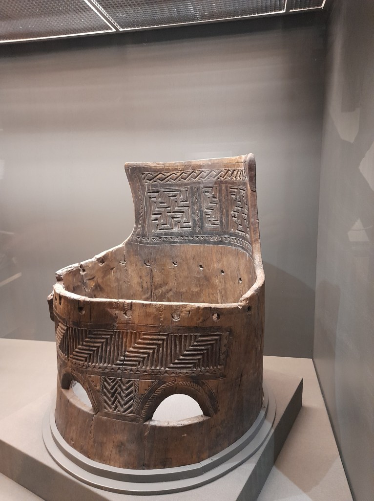 Der Thron aus der Marsch ist der Nachweis von sogenannten Klotzstühlen wie sie auf der Fallward zur Ausgrabung kamen. In dem Fall ist es ein reich beschnitzter Klotzstuhl, er gehört zu den bekanntesten Stücken.