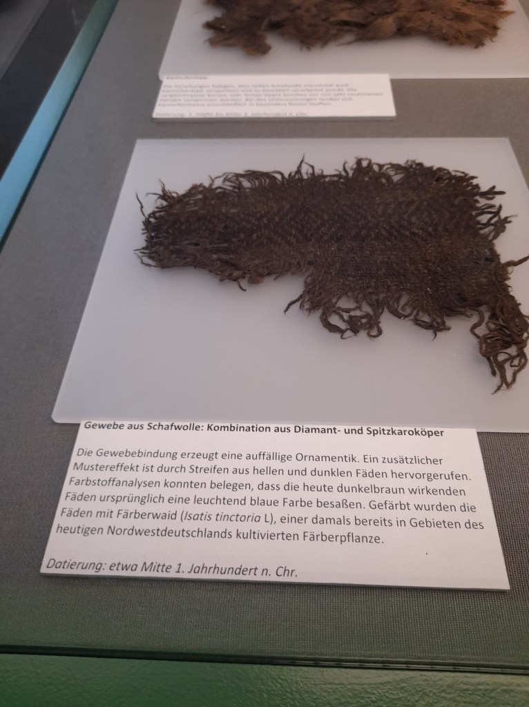 Auch das ausgestellte Gewebe aus Schafwolle in einer Kombination aus Diamant – und Spitzkarokörper erfährt Aufmerksamkeit. Die Gewebebindung erzeugt eine auffällige Ornamentik. Farbstoffanalysen konnten belegen, dass die heute dunkelbraun wirkenden Fäden ursprünglich eine leuchtend blaue Farbe besaßen. Gefärbt wurden die Fäden mit Färberwald, einer damals bereits in Gebieten des heutigen Nordwestdeutschlands kultivierten Färberpflanze. (Datierung etwa Mitte des 1. Jahrhunderts.)
