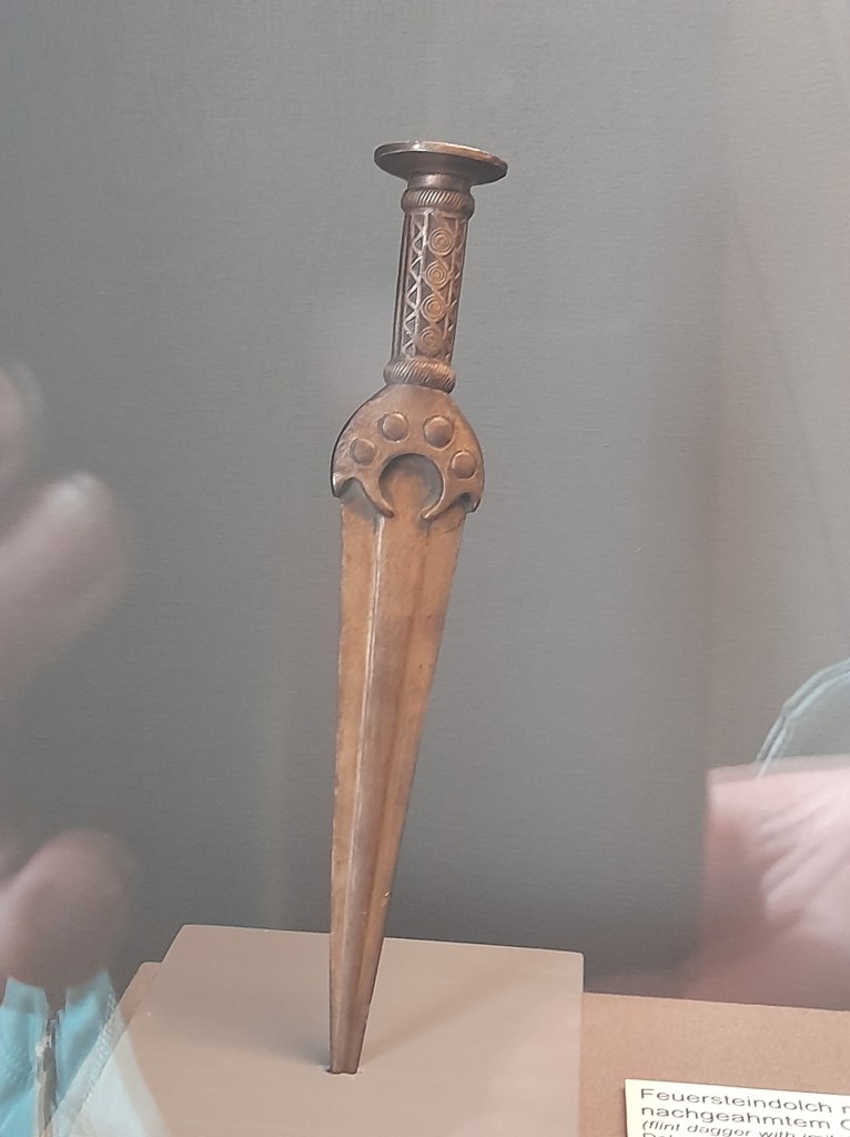 Wir entdecken die Replik eines Dolches aus Wanna. Dieser aus einem Grabhügel stammende Vollgriffdolch zählt zu den prunkvollsten Metallfunden der Bronzezeit aus der Region. Das Original befindet sich im Niedersächsischen Landesmuseum in Hannover.