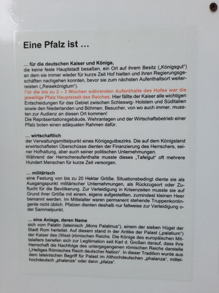 - Im Jahr 1174 sammelte Kaiser Friedrich I. Barbarossa hier ein Heer, das er für seinen beabsichtigten Kriegszug nach Oberitalien gegen die Stadt Alessandria benötigte. In der Pfalz versöhnte sich 1194 Kaiser Heinrich VI. mit Herzog Heinrich dem Löwen und legte damit den langandauernden Streit zwischen Staufern und Welfen bei.