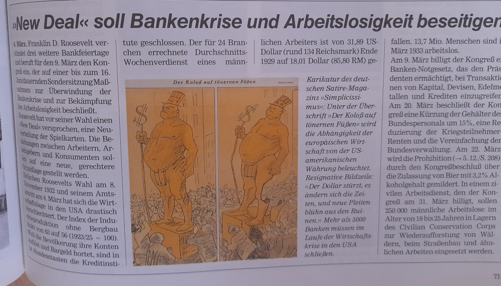 Nach dem Börsencrash 1929 weitete sich in den USA die Finanzkrise zu einer weltweiten Wirtschaftskrise aus. Franklin Roosevelt gab als Präsidentschaftskandidat der Demokraten 1932 die Parole von „New Deal“ raus. Er gewann die Wahl und setzte zahlreiche Reformen um. Wer waren die Nutznießer? Danach muss man nicht lange suchen: Das Bankenkartell.