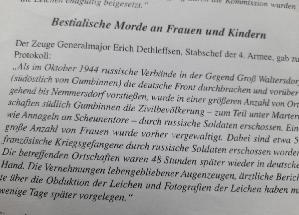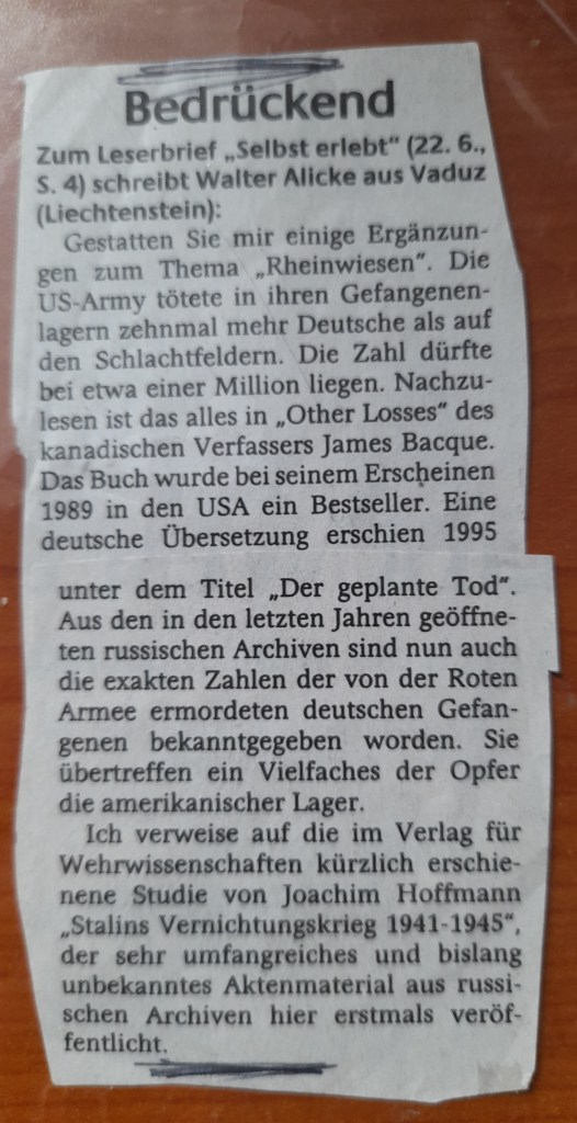 Weiter: „Einige Beobachter wie Robert Murphy, der politische Berater von Eisenhower, Bertrand Russel, der britische Philosoph, und Victor Gollancz, der berühmte Verleger, haben seinerzeit wohl bemerkt, dass die Vertreibung und Verschleppung der Deutschen auch schwierige juristische und moralische Fragen aufwarfen, und das eine gefährliche Doppelmoral am Spiele war, denn zur gleichen Zeit als die Siegermächte die NS-Verbrechen verurteilten, vertrieben die Polen und Tschechen Millionen Deutscher aus ihrer Heimat, während etwa eine Million zur Sklavenarbeit nach Workuta, in die Ural-Gruben, und nach Sibirien verschleppt wurde. Bekanntlich sind zwei Millionen Deutscher durch die Strapazen umgekommen, mindestens 400.000 davon durch unmittelbare Gewalt, durch Mord und Totschlag und infolge unzähliger Massenvergewaltigungen“.