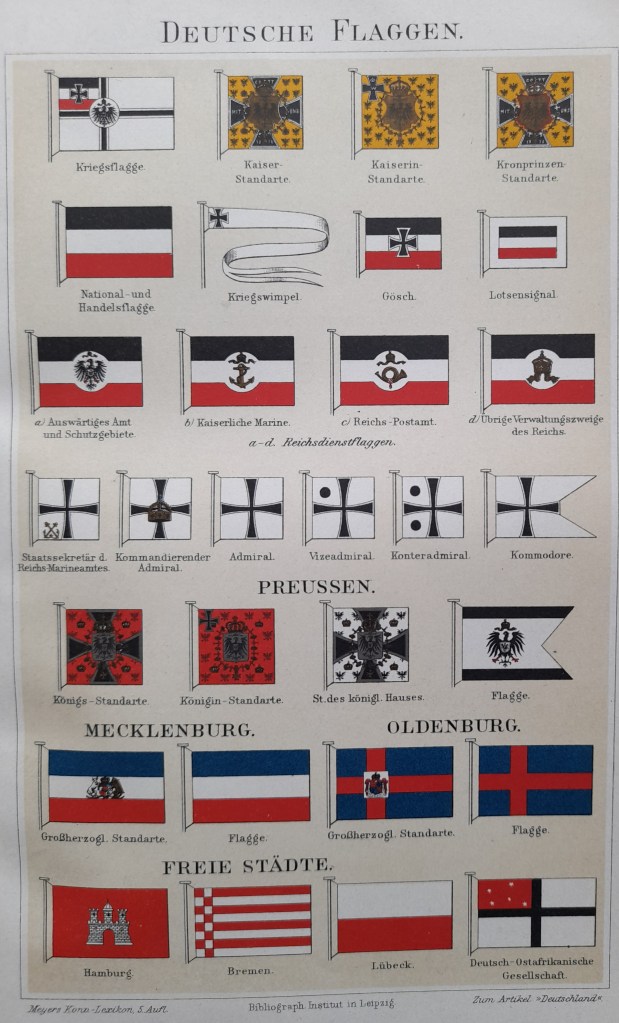 Die Bilder, die ihr hier seht, oder besser die kleine Flaggenkunde stammen aus Meyers Konversationslexikon aus dem Jahr 1894 /Vierter Band.