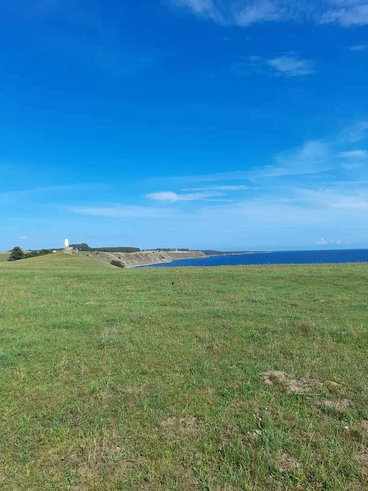 Links von uns liegt eine Vogelstation, vor uns bizarre Klippen, hinter uns Getreidelder, die gerade bewirtschaftet werden und noch weiter hinten thront der Leuchtturm von Gedser über allem.