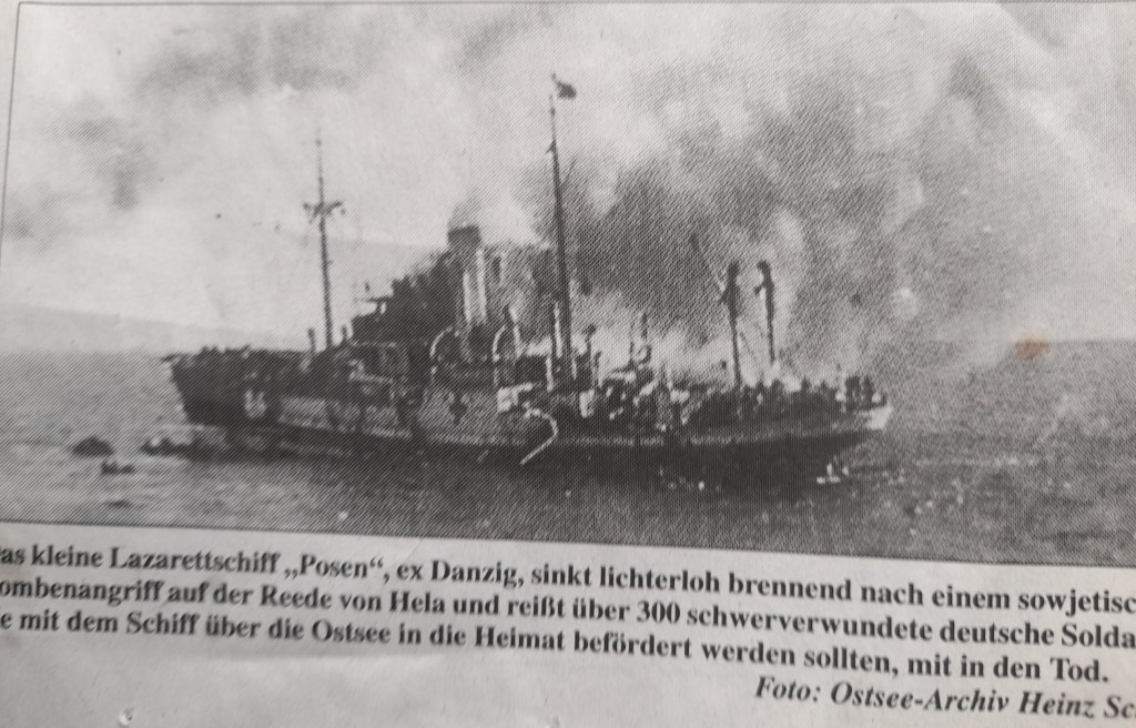 „Vom 10. bis 14. April 1943 erlebte ich an Bord des Dampfers „General San Martin, der auf Hela-Reede ankerte, um Flüchtlinge aufzunehmen und sie nach Kopenhagen zu bringen, „die Hölle von Hela“. Immer wieder wurden wir von sowjetischen Flugzeugen angegriffen. Doch wir hatten Glück. Bombenvolltreffer erhielten die in Sichtweite von und liegenden zwei Schiffe, das kleine Lazarettschiff „Posen“ und der Dampfer „Moltkefels“. Beide Schiffe brannten sofort lichterloh, Frauen und Kinder liefen als brennende Fackeln über Deck, kamen in den Flammen um, erstickten im Rauch, ertranken in der Ostsee und sanken mit dem Schiff auf den Grund der Ostsee.