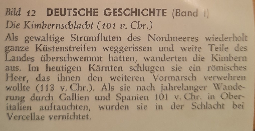 Und getrennt wurden sie beide von Marius in furchtbaren Schlachten vernichtet. Zuerst die Teutonen bei Aquä Sextiä (heute Aix), 100 v. u. Z. , und im folgenden Jahr die Kimbern bei Vercellae (zwischen Turin und Mailand).