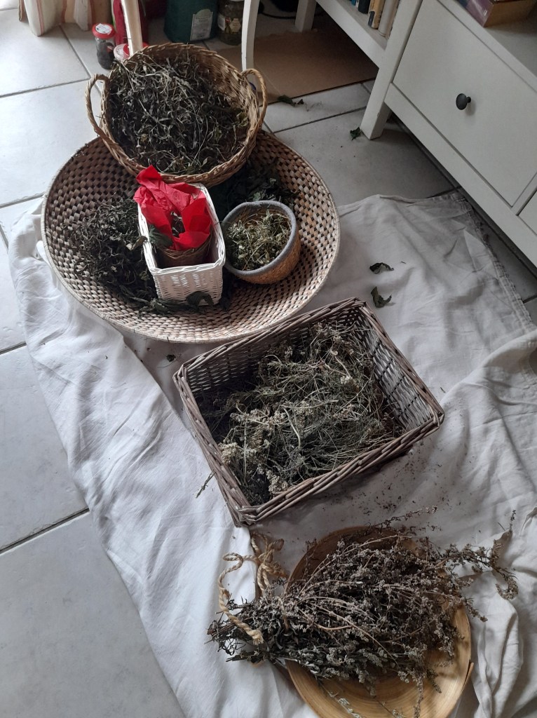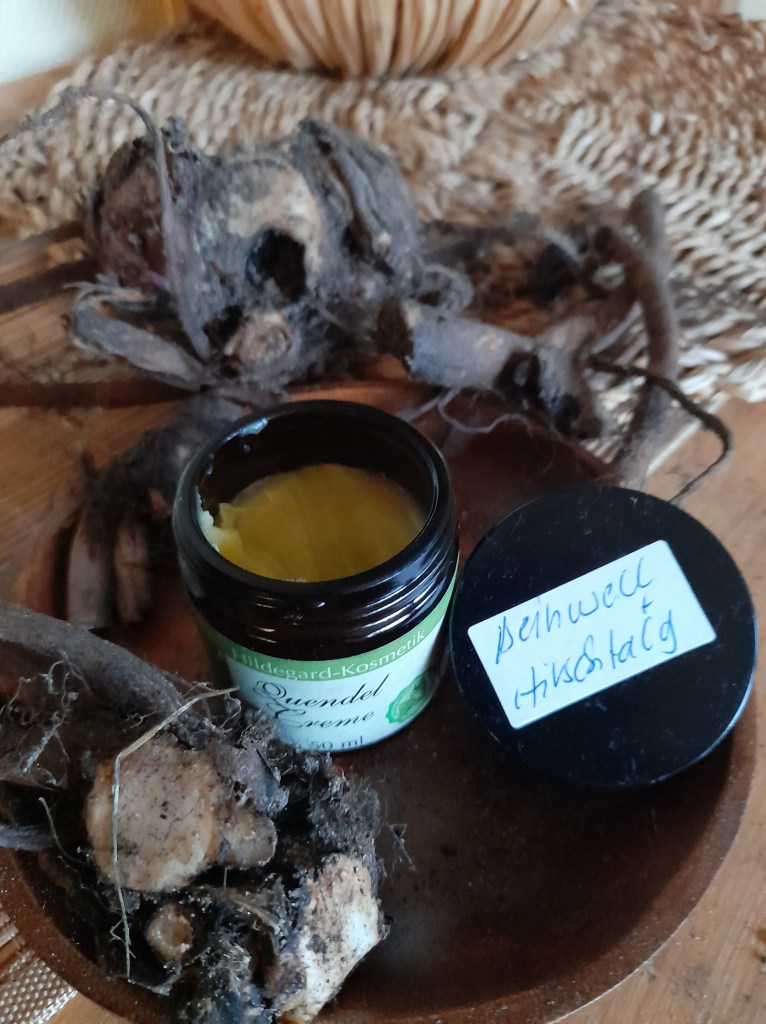 Vorhin habe ich noch schnell die letzten Samenkörner der Mariendistel in Alkohol getränkt (die bereits angesetzten ergeben schon die typische gelbe Farbe einer Mariendisteltinktur), die letzten Blüten der Ringelblume verbleiben noch etwa zwei Wochen in ihrem Ölbad und die Beinwell-Wurzel (gestern ausgebuddelt) möchte noch „tranchiert“ werden, um das Salben-Repertoire auffüllen zu können. Ebenfalls in der Warteschleife sind noch die Löwenzahnwurzel-Tinktur und das Schöllkraut.