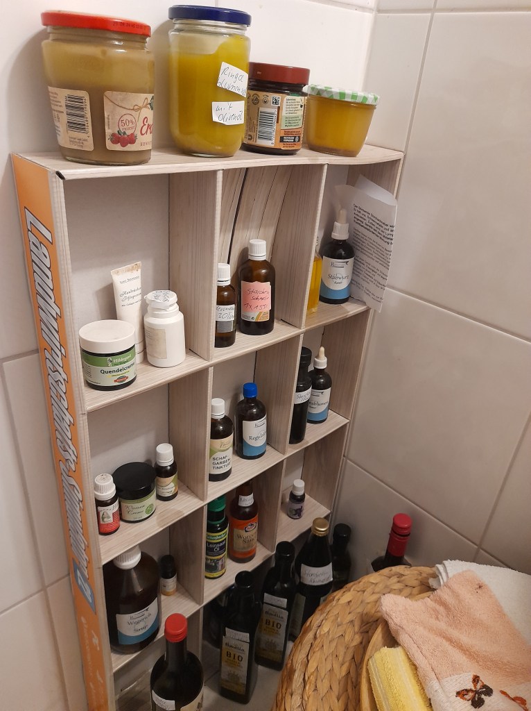 Kräuter und Tinkturen haben bereits ihren festen Platz eingenommen, nur wenige warten noch auf die Fertigstellung.