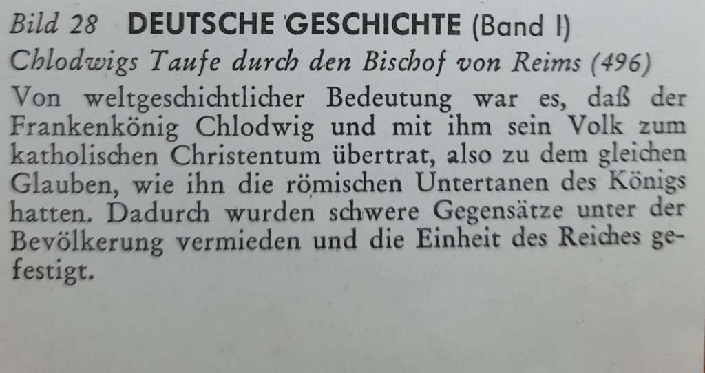 Von größter weltgeschichtlicher Bedeutung wurde es, dass Chlodwig – und mit ihm sein Volk – nach dem Sieg über die Alemannen zum Christentum übertrat, und zwar zum katholischen Bekenntnis, nicht zum arianischen wie alle übrigen Germanen bis dahin. Dadurch, dass ihm der griechische Kaiser den Titel eins römischen Patrizius verlieh, betrachteten ihn von da an seine gallisch-römischen Untertanen als ihren rechtmäßigen Herren, und auch seinen Frankenvölkern erschien er im Glanz einer höheren Würde.
