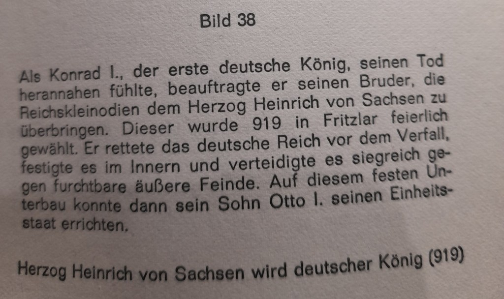 Im Innern gelang es Heinrich vor allem, einen losen Staatenbund zu schaffen, der sämtliche Stämme in freiwilligem Gehorsam zusammenhielt. Er war das Fundament, auf dem sein Otto I. den straffen Einheitsstaat errichten konnte