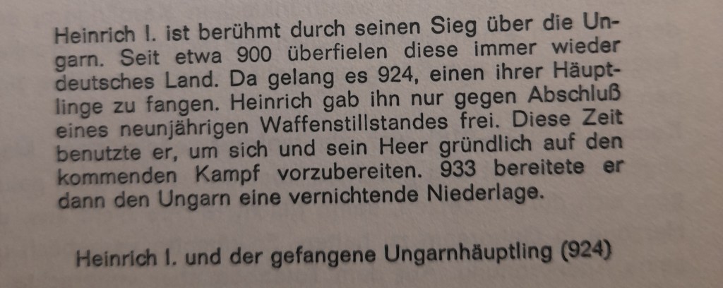 Nach außen schützte Heinrich die Ostgrenze des Reiches, indem er vor allem den Einfällen der Ungarn ein Ende machte, die 924 raubend und mordend bis nach Thüringen vorgedrungen waren. Als es gelang, einen hohen ungarischen Häuptling gefangen zu nehmen, gab er ihn nur unter der Bedingung eines neunjährigen Waffenstillstandes frei.