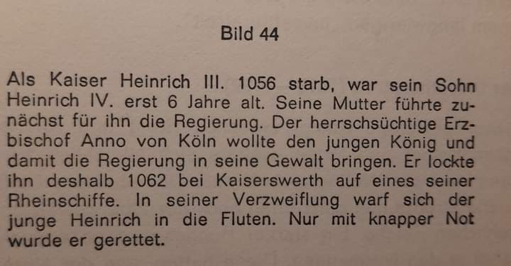 Für den unmündigen Heinrich führte zunächst seine Mutter die Regierung. Der stolze und herrschsüchtige Erzbischof Anno von Köln strebte danach, den jungen König und damit die Regierung in seine Gewalt zu bringen. Er lockte den Zwölfjährigen auf eines seiner Rheinschiffe und ließ es rasch von Ufer abstoßen. In seiner Verzweiflung warf sich der junge Heinrich in die Fluten. Nur mit knapper Not wurde er gerettet und aufs Schiff zurückgebracht, wo ihn der Erzbischof allmählich beruhigte.