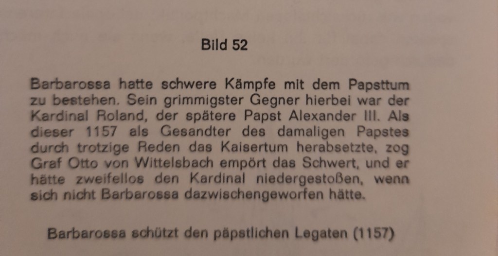 Zu den gewalttätigen Übergriffen Mailands gegen kaisertreue Städte kam der wachsende Widerstand des Papsttums. Sein grimmiger Gegner, der fanatische Kämpfer für die Oberherrschaft des Papsttums war der Kardinal Roland. Auf dem Reichstag zu Besacon warf er als päpstlicher Gesandter die trotzige Frage auf: „Von wem hat denn der Kaiser das Reich, wenn nicht vom Papst?“