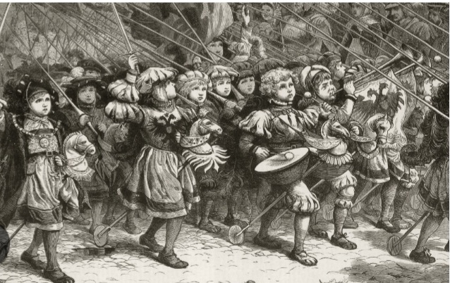 Unter der Führung eines deutschen Knaben zogen mehrere tausend Kinder aus Deutschland und Frankreich über die Alpen. Aber schon in Italien wurden sie bereits aufgerieben, teils bettelten sie sich zur Heimat zurück. Noch schlimmer ging es den weit zahlreicheren Scharen, die sich in Marseille sammelten. Sie wurden dort von gewissenlosen Unternehmern auf Schiffe verladen und – soweit sie nicht schon auf der See zugrunde gingen – als Sklaven nach Afrika verkauft.