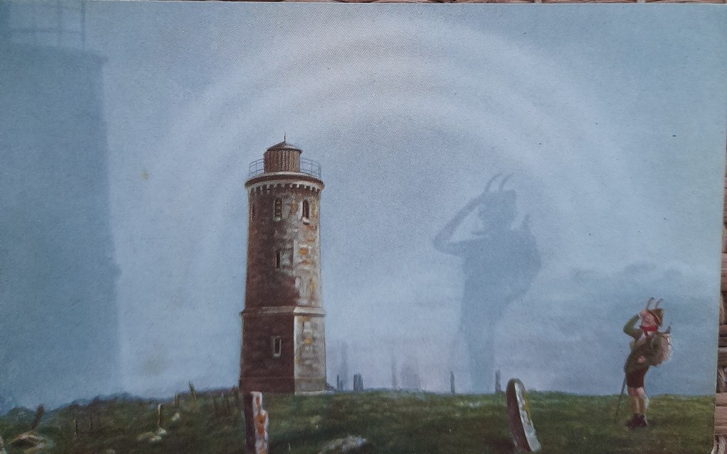 Das Bild (eine alte Ansichtskarte) zeigt das Phänomen des Brockengespenstes, also eine Figur, die sich nicht oder kaum verändert, doch der Nebel Schatten projiziert innerhalb der Nebelbank.