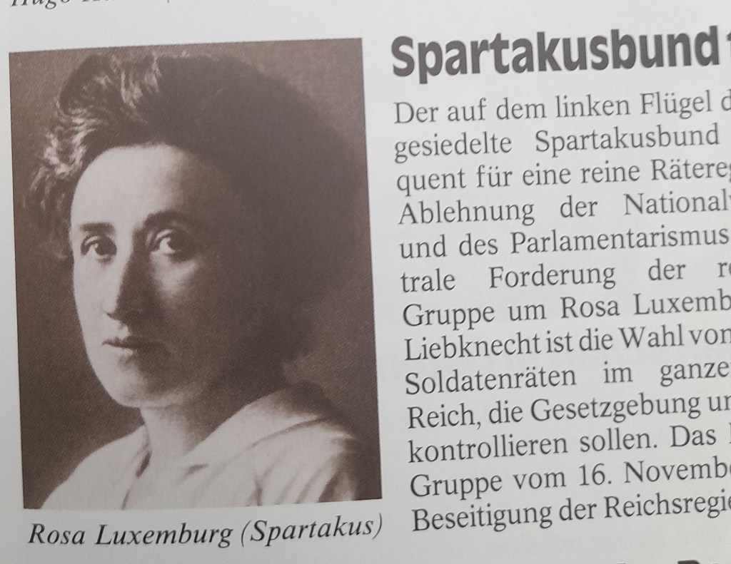Die aus einer jüdischen Kaufmannsfamilie in Polen stammende Rosa LUXEMBURG (1878-1919) gehörte, zusammen mit Karl LIEBKNECHT (1871-1919), zum äußersten linken Flügel der SPD. Beide gründeten 1916 gegen die eigene Partei die >SpartakusgruppeSpartakusbund< nannte. Bereits am 30. Dezember 1918 verschmolz dieser mit Bremer Linksradikalen zur »Kommunistischen Partei Deutschlands< (>KPD<).