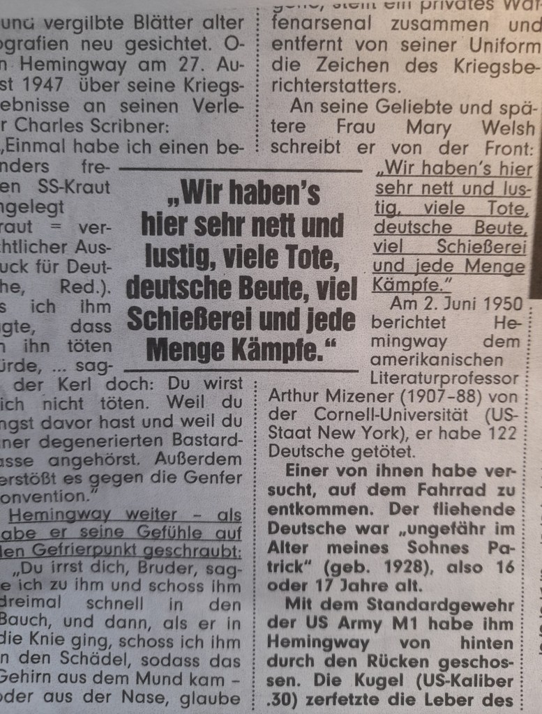 Nach Ernest Hemingways Freitod war in Hollywood ein Film über sein Leben geplant. Hemingway als Kriegsaufklärer, als Spion – weniger über seine Eigenschaft als Mörder. Dafür wurde er 1950 von der New York Times „der bedeutendste Schriftsteller… der größte seit Shakespeare“ genannt, und er erhielt 1954 den Nobelpreis. Was die Person Hemingway betrifft > (siehe Foto und Kommentar.