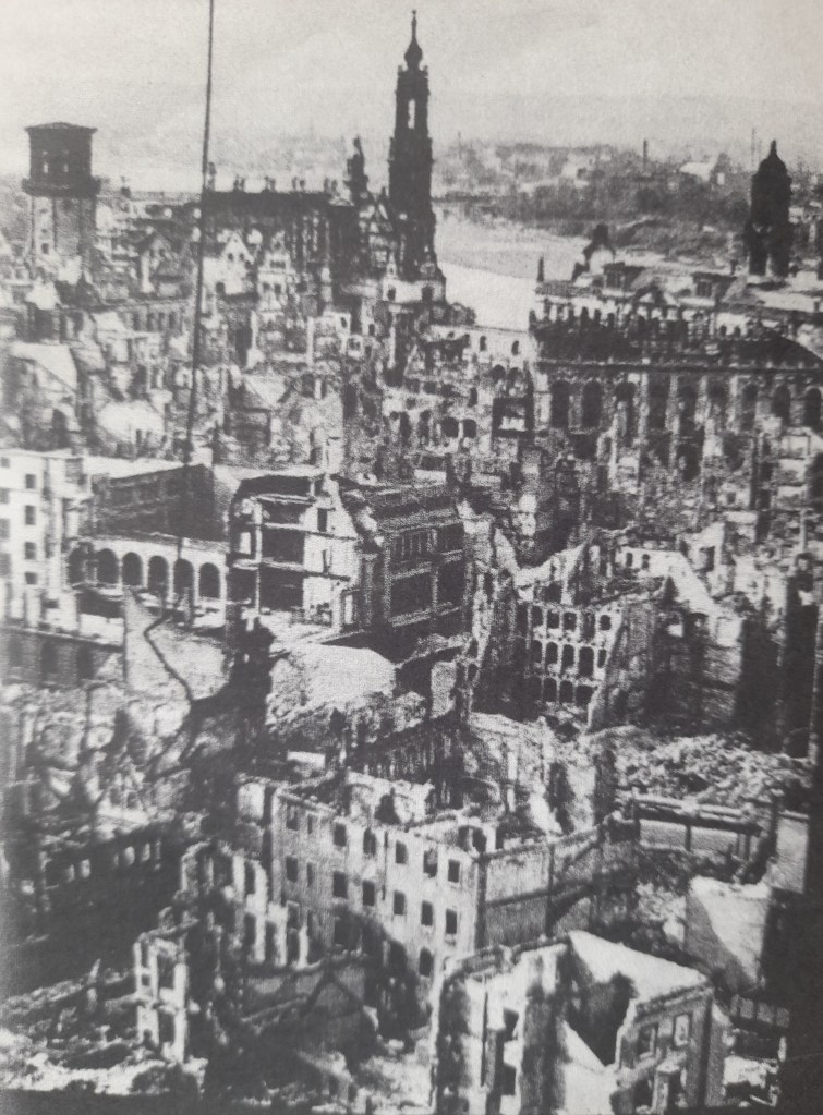 Hunderttausende verängstigte, hungrige, verzweifelte Flüchtlinge drängten sich in der Altstadt, lagerten auf den Bürgersteigen, in jedem Garten und jedem Stadtpark. Eng aneinandergepresst, um nicht zu erfrieren, schliefen sie auf dem Boden. Wimmernde Kinder bettelten um Essen. Die städtirschen Sozialdienste waren überfordert, obwohl sie taten, was in ihrer Macht stand, um die Menschen mit Nahrung und dem Nötigsten zu versorgen. – Dann kamen die Bomber.