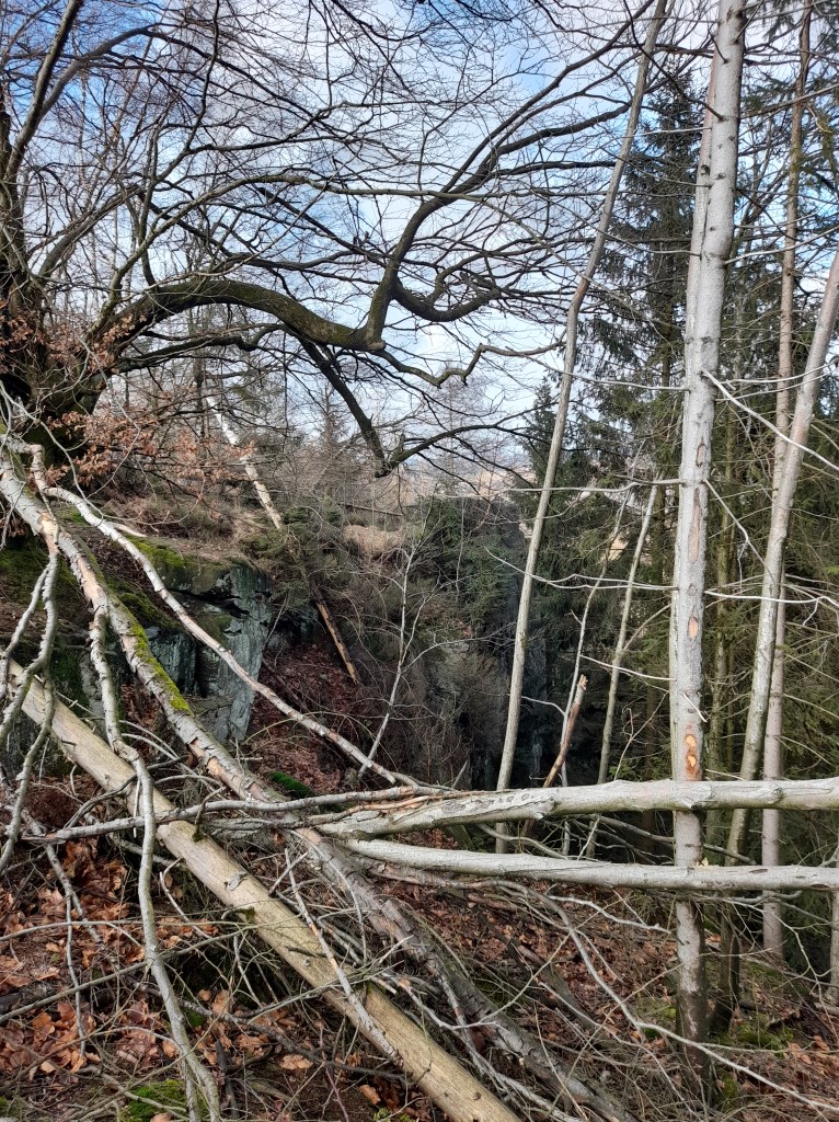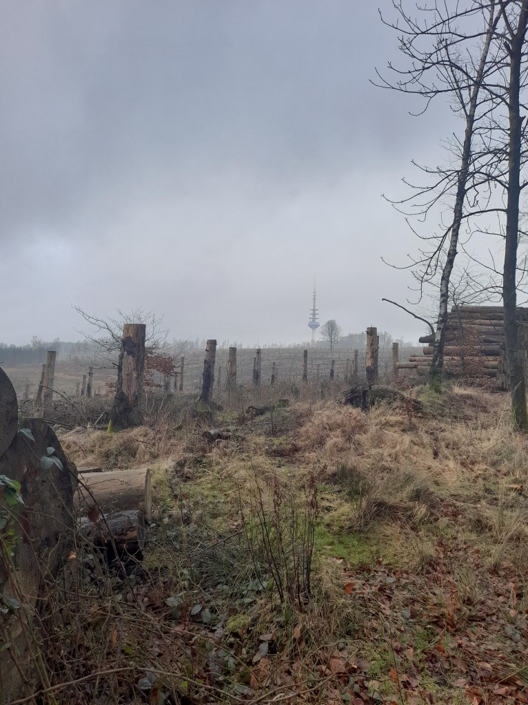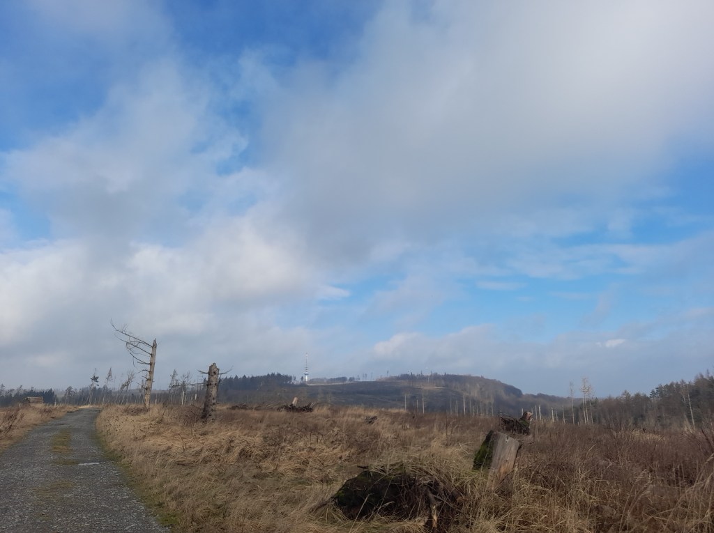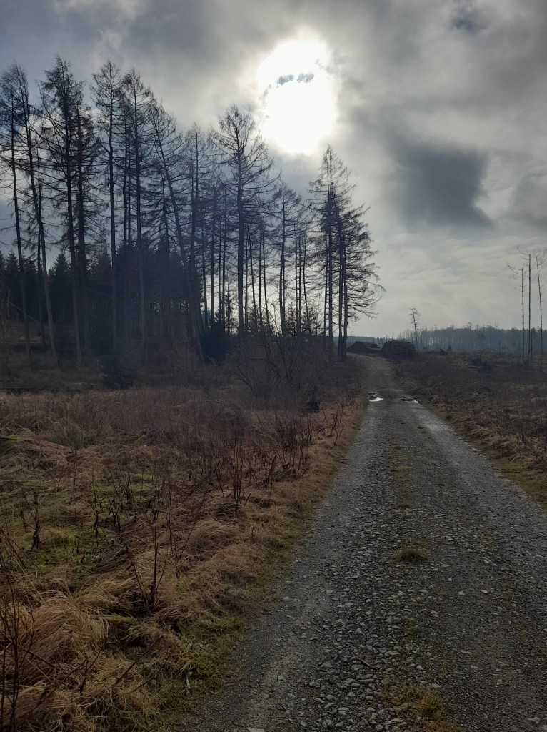 Der Wanderweg erstreckte sich wie befürchtet entlang der weitläufigen abgeholzten Flächen. Keine Ende in Sicht. Auf einem Schild war vermerkt, dass dieses Totholz im Rahmen der Klimaveränderung seinen Zweck erfüllt. Ich werde das nicht weiter erläutern, weil dieses Argument für uns wenig schlüssig ist.