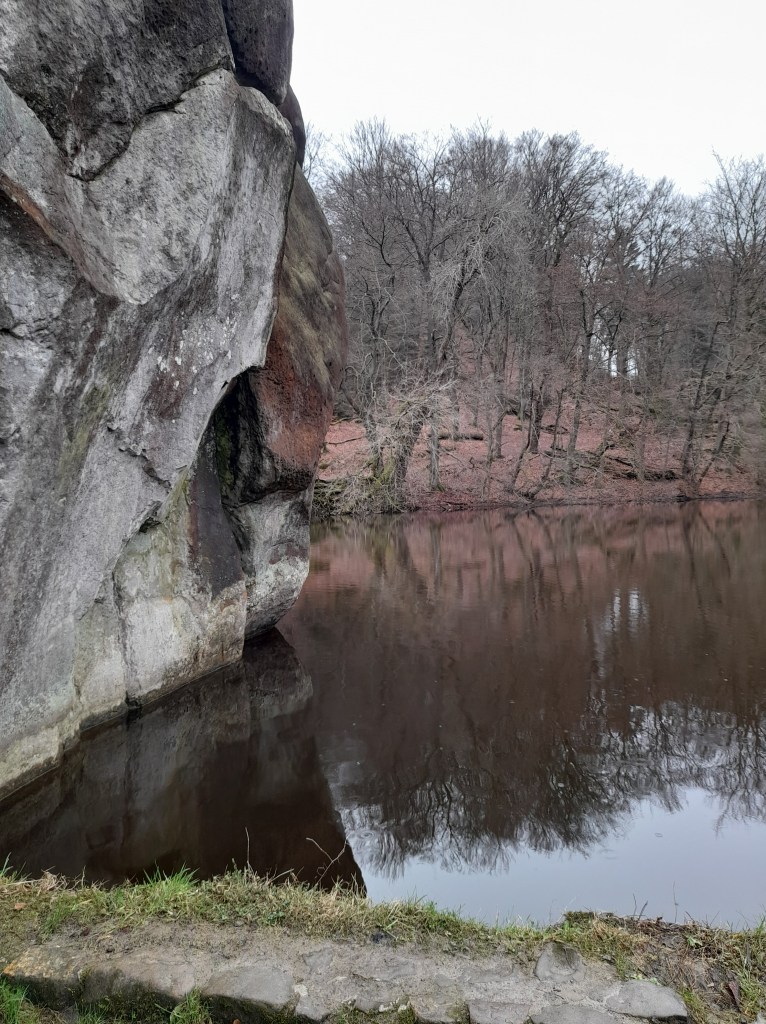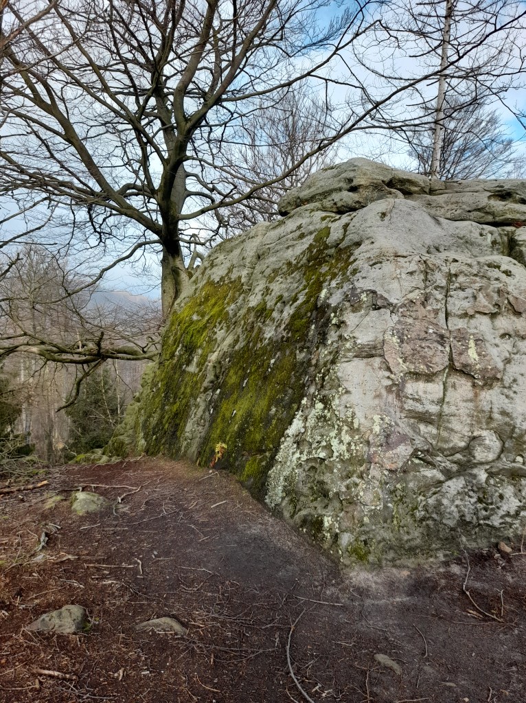 Was auch immer der Grund für dieses unsägliche Tabula rasa sei, wir sind unbeirrt weiter gelaufen, bis zum Steilabfall des Eggegebirgskammes. vorbei an an der Karlsschanze, einer einst mächtigen Befestigungsanlage, weiter über den Klippenweg und dort bis zum „Faulen Jäger“, einem sechs Meter hohen Opferstein mitt einem Umfang von 24 Metern. Hier haben die heidnischen Sachsen ihren Gott Wodan geehrt und trafen sich regelmäßig zu festen Zeiten. Mit der Ausbreitung des Christentums wurden die Treffen immer weniger.