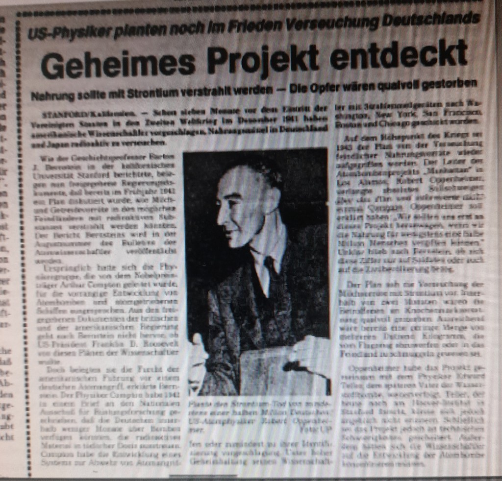 So haben schon sieben Monate vor dem Eintritt der USA in den Zweiten Weltkrieg US-Wissenschaftler im Frühjahr 1941 vorgeschlagen und diskutiert, Nahrungsmittel in Deutschland und Japan radioaktiv zu verseuchen, sodass die Betroffenen nach wenigen Wochen daran qualvoll gestorben wären.