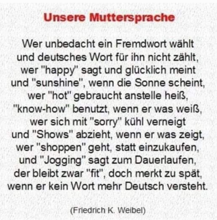 Doch statt das zu beherzigen, wird alles daran gesetzt der deutschen Sprache und ihrer Begrifflichkeiten den Garaus zu machen. Und das leider mit großem Erfolg.