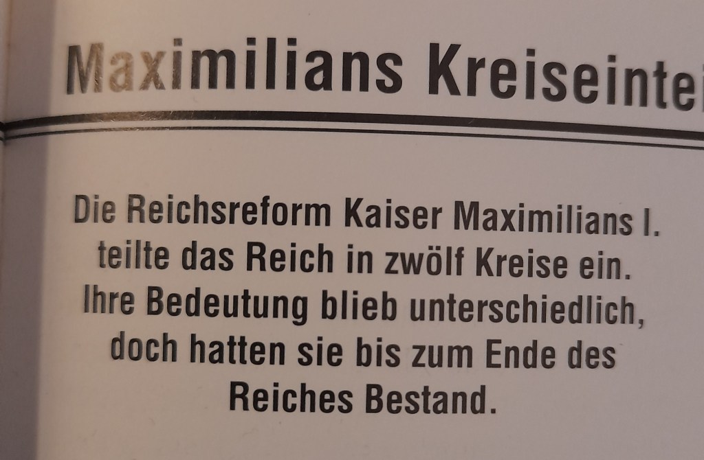 Ferner wurde Deutschland in zehn Kreise eingeteilt, von denen jeder ein Kriegskontingent stellen sollte, um die Urteile des Reichskammergerichts durchzuführen. Aber auch dieses Reichsheer stand nur auf dem Papier. Auf dem Reichstag zu Augsburg 1500 wurde beschlossen, ein ständiges „Reichsregiment“ zu bilden – eine Reichsregierung, bestehend aus 20 Mitgliedern.