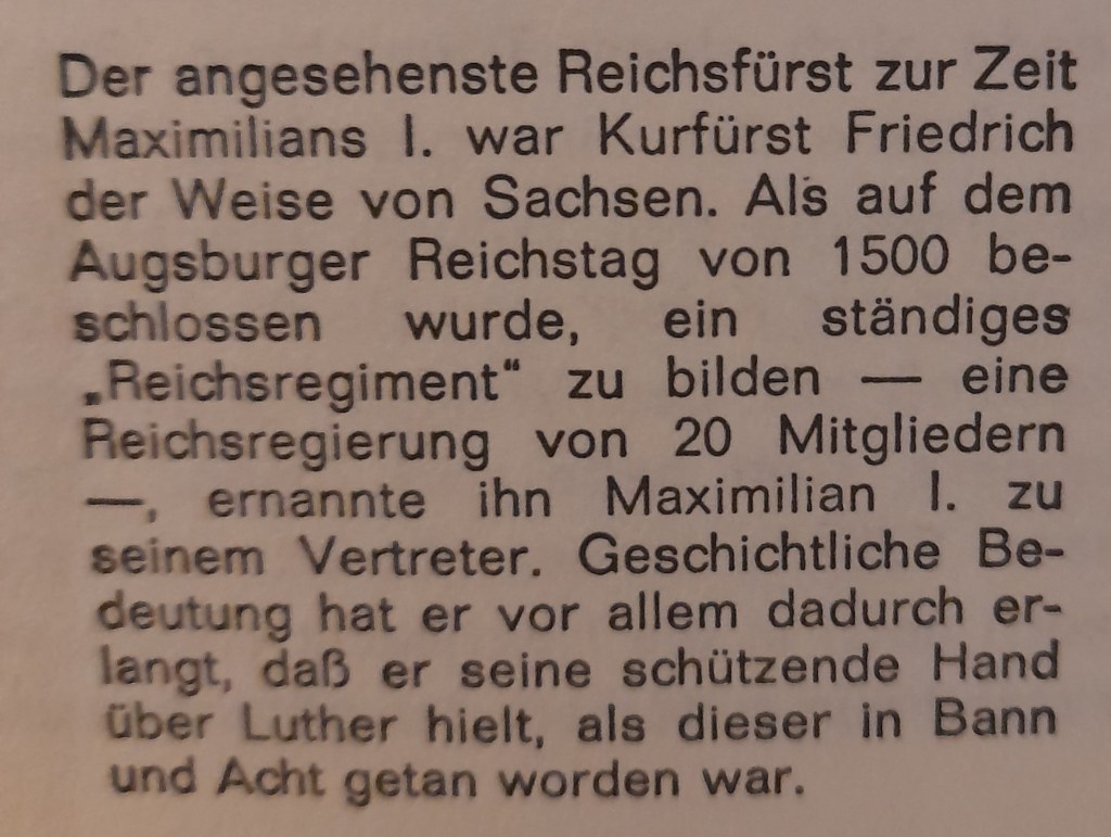 Zu seinem Stellvertreter bei dieser Behörde ernannte Maximilian den Kurfürsten Friedrich den Weisen von Sachsen, den angesehensten Fürsten der Zeit. Von geschichtlicher Bedeutung ist dieser vor allem dadurch geworden , dass er seine schützende Hand über Luther hielt, als dieser in Bann und Acht getan worden war. Das Reichsregiment war nur von kurzer Dauer.