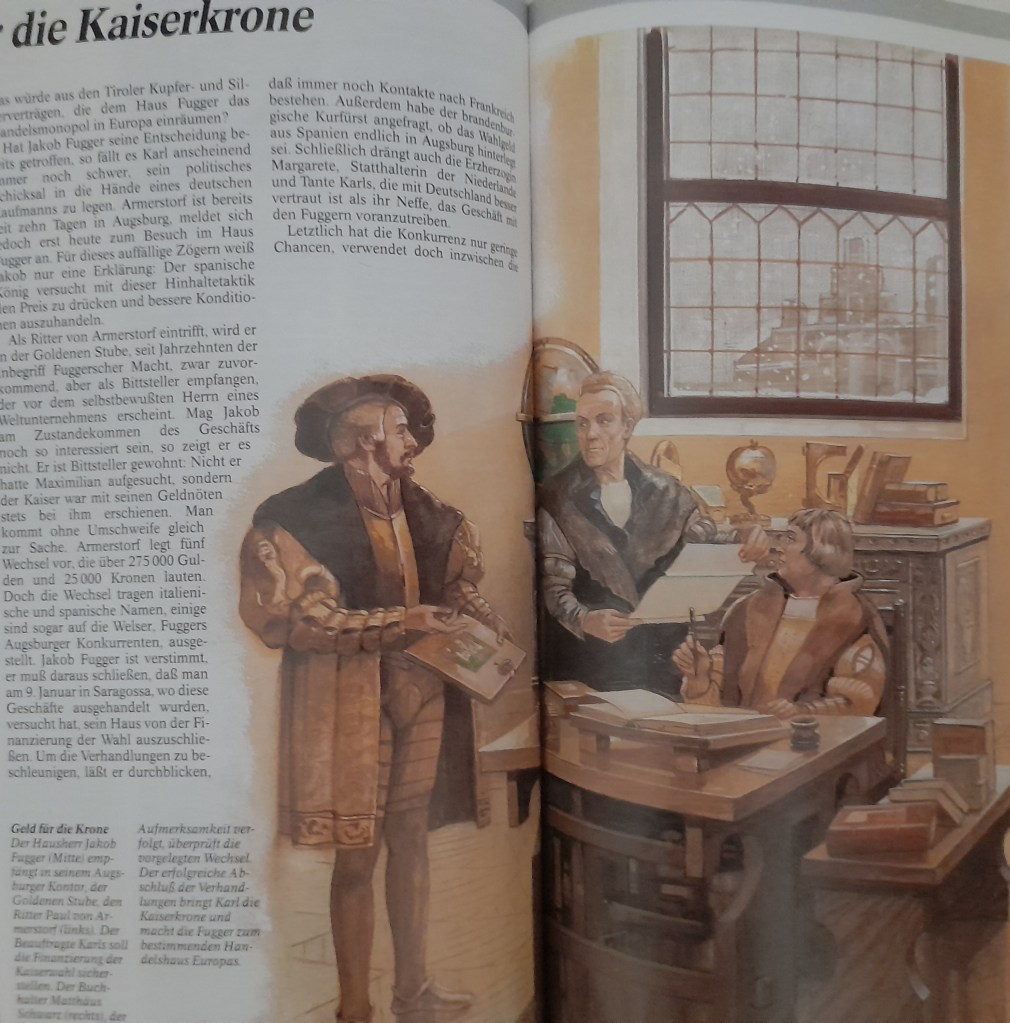 Erwähnenswert: Die Kaufmannsfamilie der Fugger in Augsburg war berühmt durch ihren sagenhaften Reichtum. Der bekannteste Sproß dieses Geschlechts ist Jakob Fugger. Viele große Herren waren seine Schuldner, sogar der Kaiser und der Papst. Karl V. weilte oft als Gast im Fuggerhaus. Bei einer solchen Gelegenheit soll Jakob Fugger vor den Augen des Kaisers einen Schuldschein über eine große Summe ins Feuer geworfen haben.