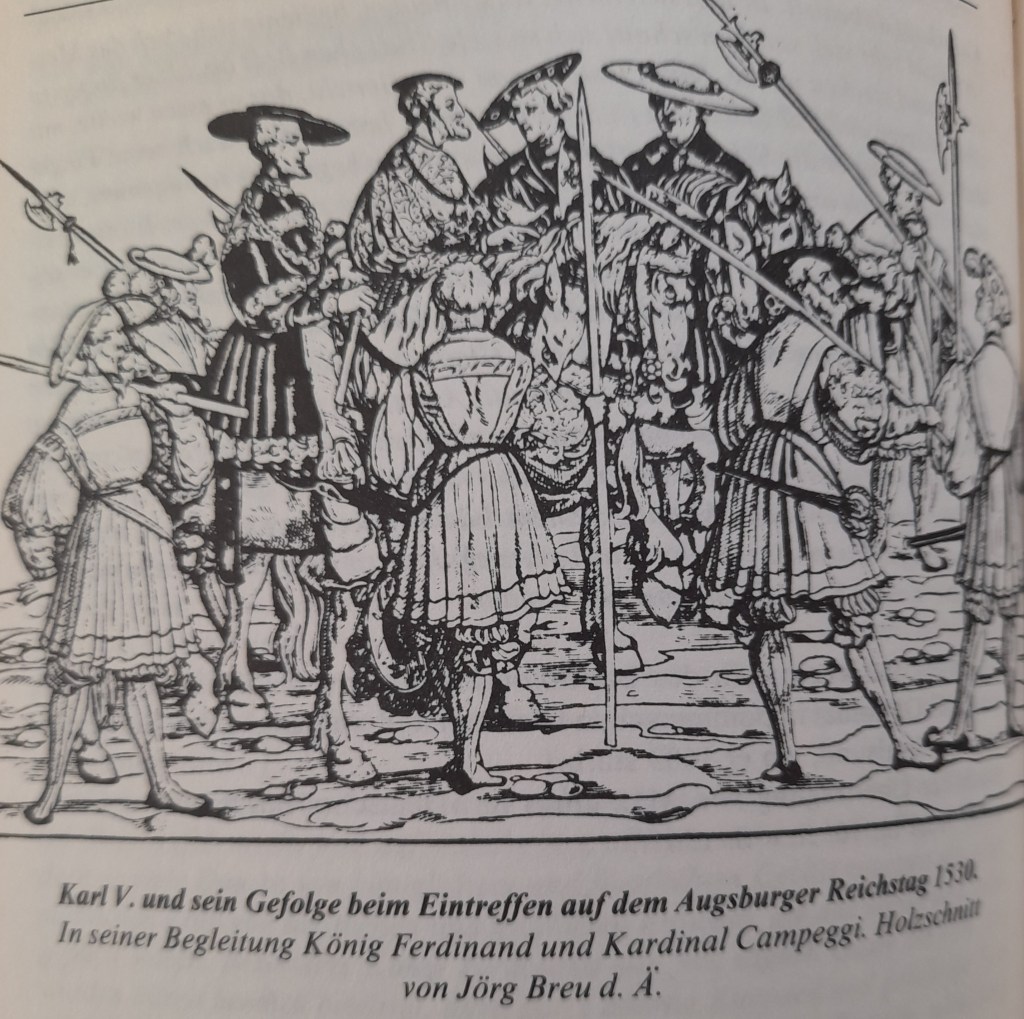 Auf dem Reichstag zu Augsburg 1530 erschien Karl V. persönlich. Die Protestanten trugen dem Kaiser ein Glaubensbekenntnis vor, die „Augsburgische Konfession“. Als keine Einigung zustande kam, erließ der Kaiser einen Reichstagsabschied, in dem die Ausbreitung der Lehre auf strengste verboten wurde. Infolgedessen schloss einen Reihe evangelischer Fürsten und Städte in dem thüringischen Städtchen Schmalkalden 1531 den „Schmalkaldischen Bund“.