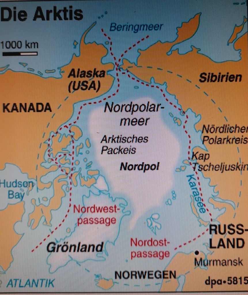 Dazu muss man wissen: Die Arktis beherbergt enorme Ressourcen wie Öl, Gas und seltene Erden. Das schmelzende Meer- und Inlandeis wird deren Förderung in Zukunft möglich machen. In der Arktis geht es also offensichtlich um Rohstoffe, um neu entstehende und ökonomisch hochsensible Schifffahrtsrouten und um die militärische Absicherung alter und neuer Einflusszonen zwischen dem Beringmeer und dem Nordatlantik.