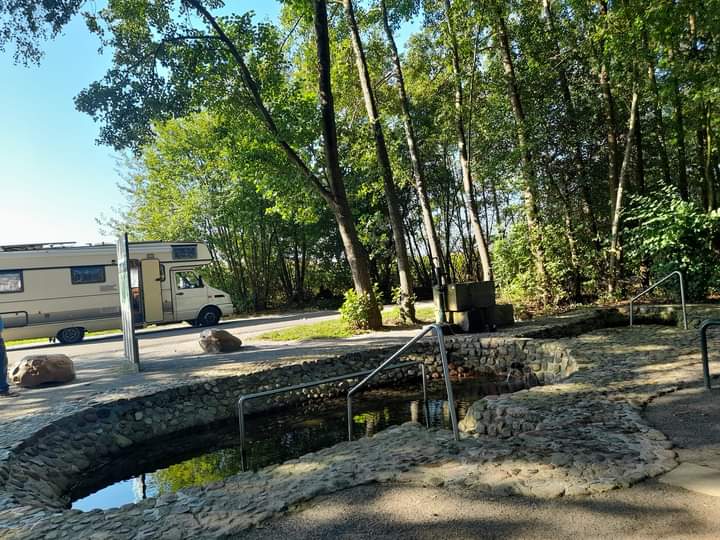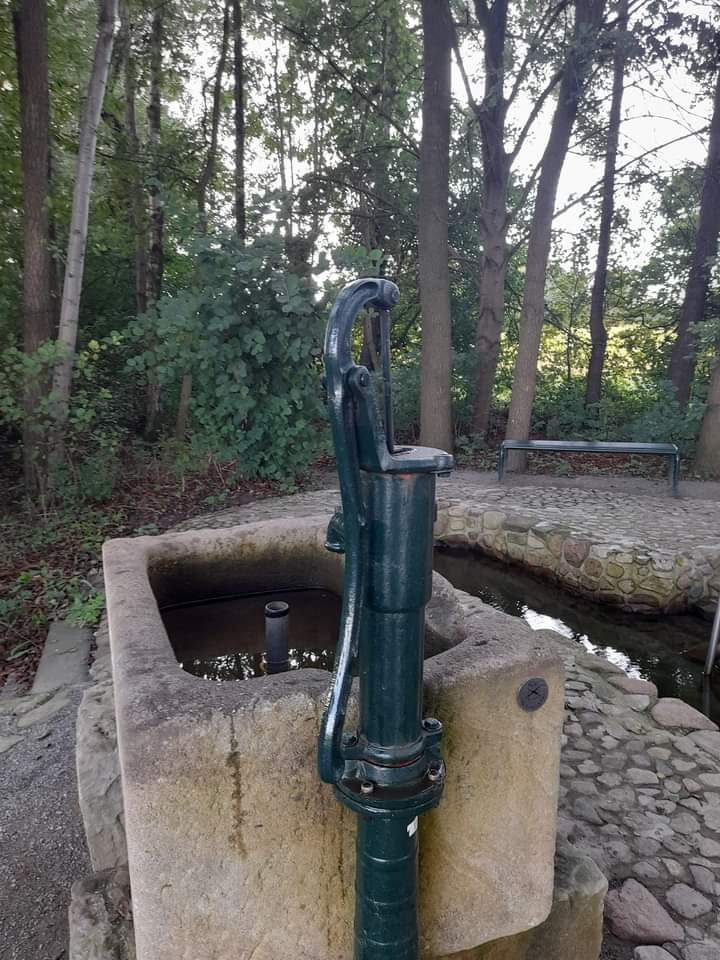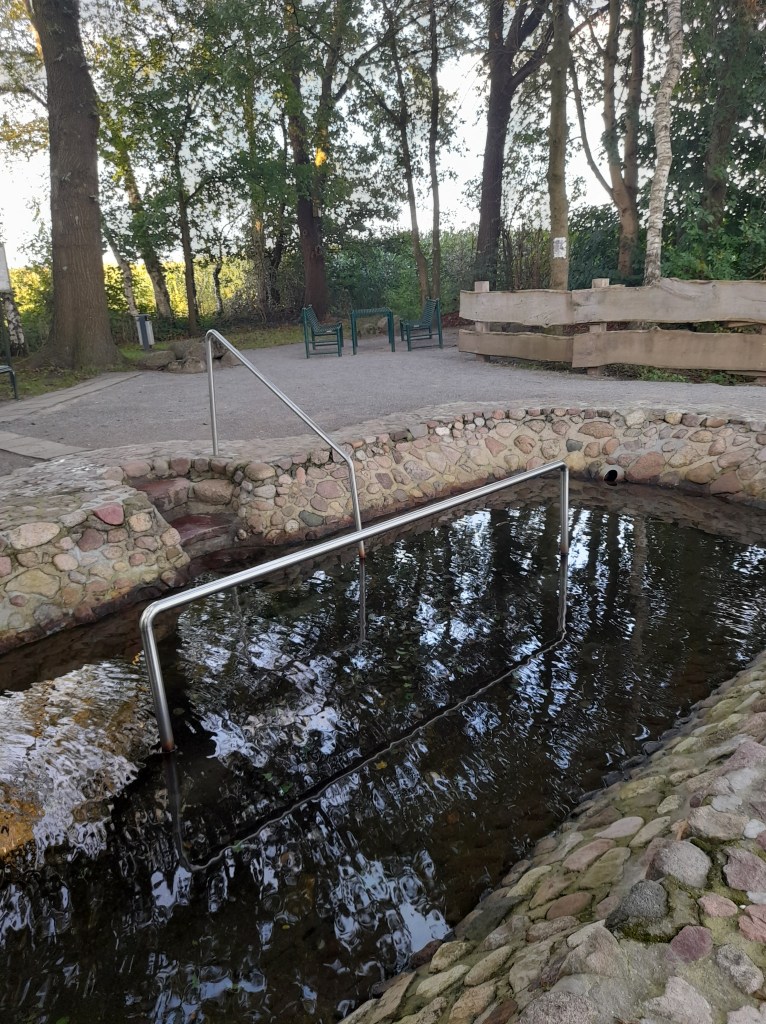 Zuvor sind wir am Kranenmeer entlang spaziert, und später verweilten wir am Artesischen Brunnen, wo wir uns frisches Wasser in den Kanister“ abgefüllt haben, das nun unsere Gläser füllt. Von solchen Trinkwasserquellen gibt es einige in Deutschland, die meisten liegen in Baden-Württemberg. Aber diese hier in NRW kann man gut erreichen. Ich bin auch noch ein bissl durchs Kneippbecken gewatschelt. Schön war’s!