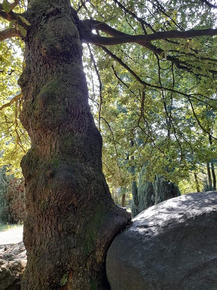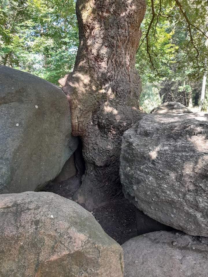 Achtet nur mal bei den Fotos darauf, wie sich die Eiche mit dem Steinkammergrab verbunden hat, und wie behütend sie ihre Äste über dem Grab ausstreckt. Wieder ein guter Ort – ein Kraftort.