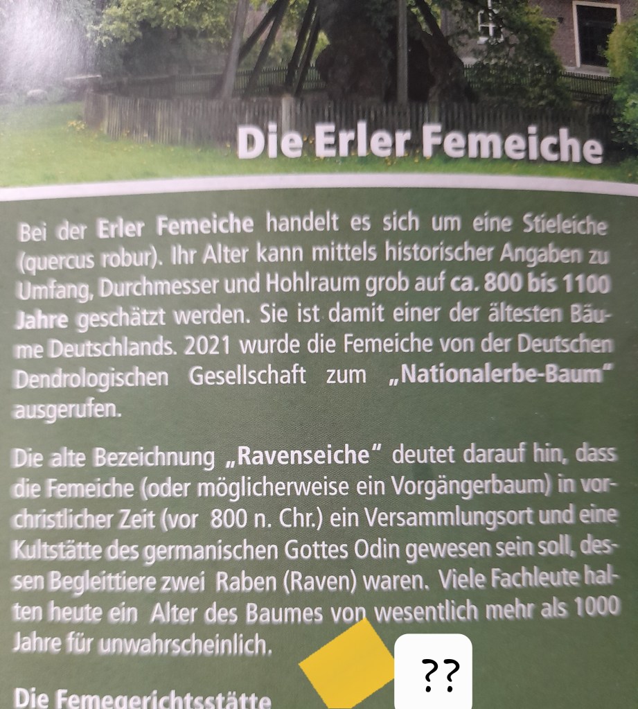 Und weiter: „Die Femeiche (genaue Art: Stieleiche = quercus robur) ist einer der ältesten Bäume Deutschlands. Aufgrund ihres Stammesdurchmessers (noch 1892 in Brusthöhe gemessen) von 4 bis 5 Meter schätzen einige ihr Alter sogar auf mehr als 1500 Jahre.