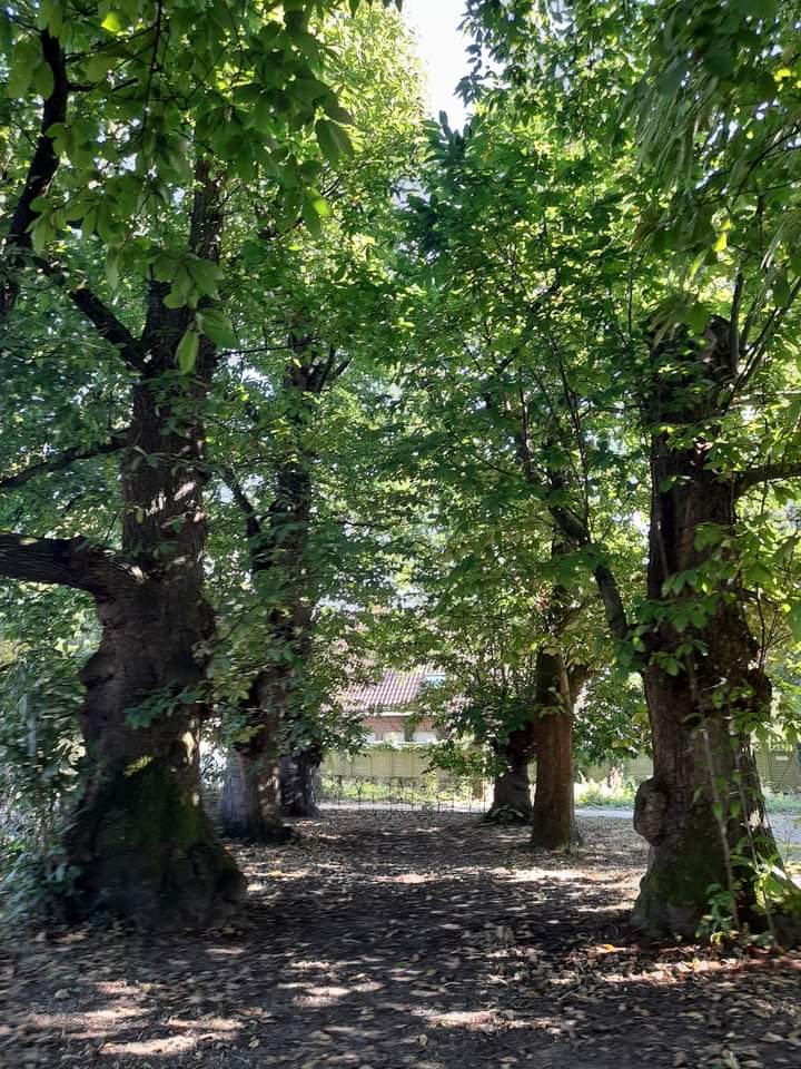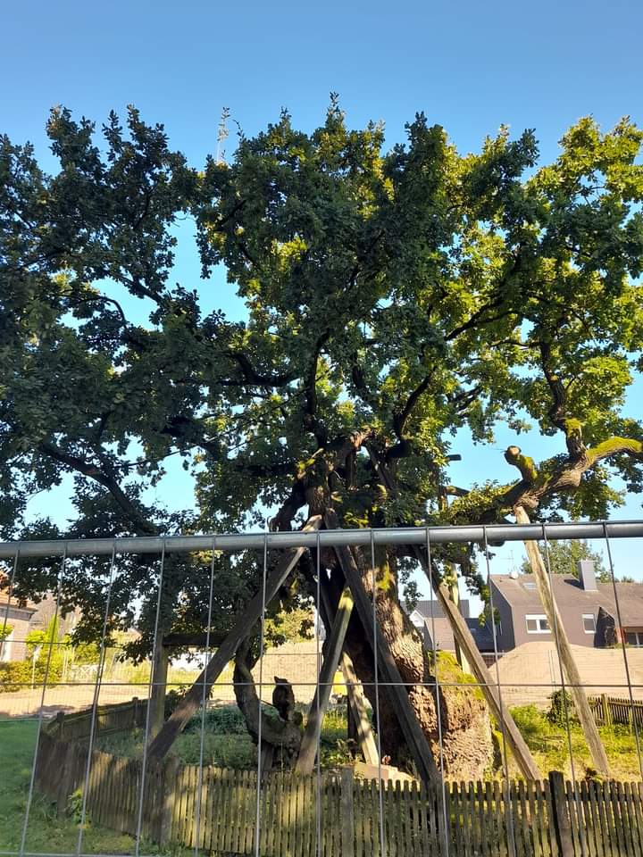 Doch jetzt zurück zur Erler Femeiche. Als wir in Erlen, einem kleinen Ort nahe Raesfeld eintrafen, um die Eiche zu bewundern, standen wir vor einer großen Baustelle. Kein Hinweis, kein Vermerk, wie man näher an die Eiche gelangen kann, die inmitten eines Wohngebietes steht, umgeben, von weiteren alten stattlichen Eichen. Wir liefen also einmal im Karree und kamen der Eiche etwas näher, leider nur bis vor einen Bauzaun. Dort entdeckten wir dann eine Kästchen mit Informationen zur Eiche vom Heimatverein Erle e. V.
