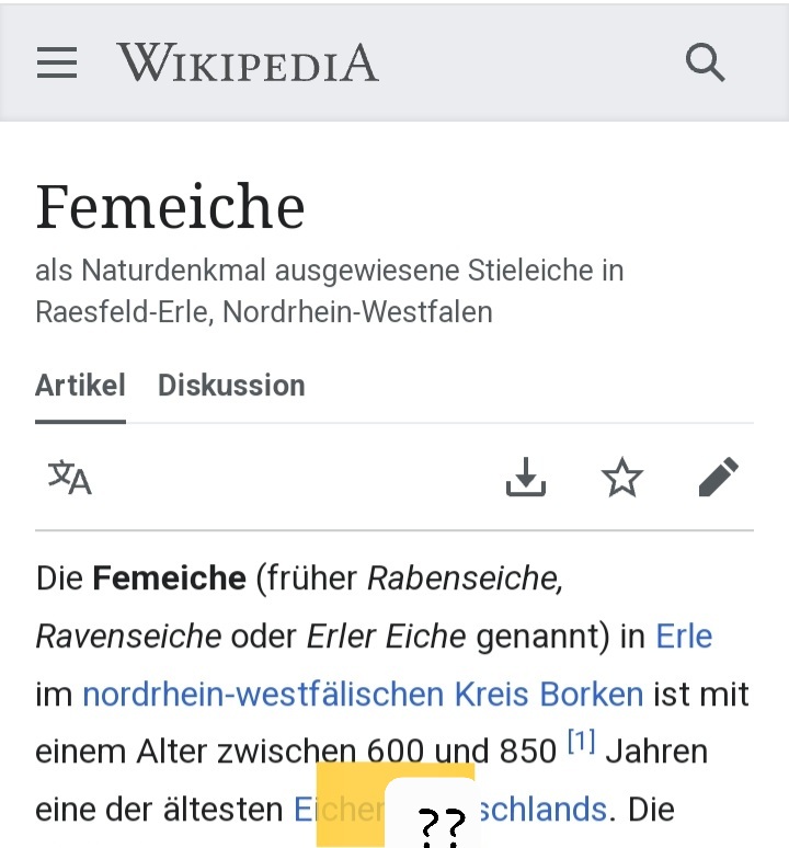 Dem nicht genug. Wikipedia setzt noch einen drauf und lichtet folgende Info ab: Die Femeiche wäre mit 600 bis 800 Jahren eine der ältesten Eichen Deutschlands.“ Wenn man so was liest, ja, dann bleibt einem wirklich die „Spucke weg“.
