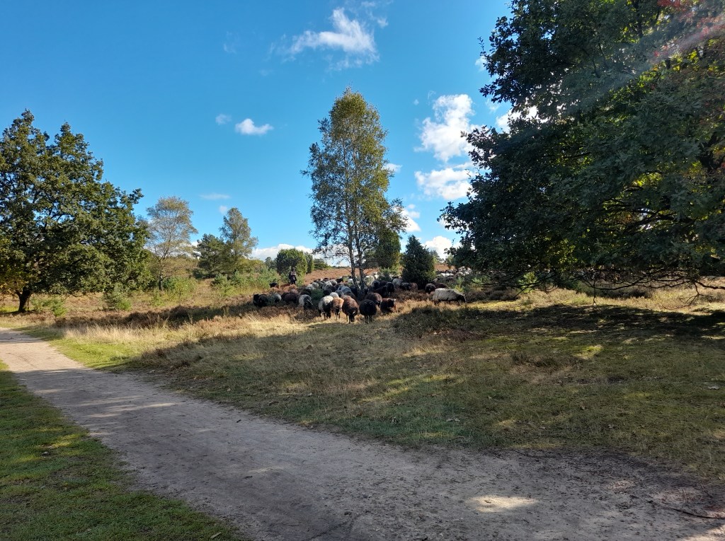Die schönsten Plätze lassen sich also nur per Fuß, mit dem Fahrrad oder mit der Pferdekutsche erobern. Nach etwa 4 Kilometer erreichen wir einen Berg. Am Fußes dieses Berges läuft eine Herde von Heidschnucken direkt auf uns zu und „kesselt“ uns ein – wunderbar!