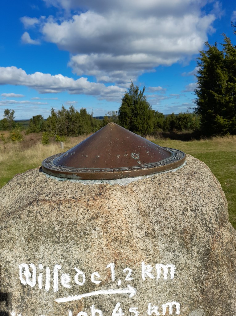 Nun geht es hinauf. Mit 169 Meter ist der Wilseder Berg die höchste Erhebung des Norddeutschen Tieflandes. Von seiner langgestreckten Kuppe aus reicht der Blick an klaren Tagen über die Heide und Wälder bis zum 34 Kilometer entfernten Lüneburg und manchmal sogar bis nach Hamburg, das 43 Kilometer nördlich liegt. Wir haben großes Glück mit dem Wetter und können weit in die Ferne schauen.