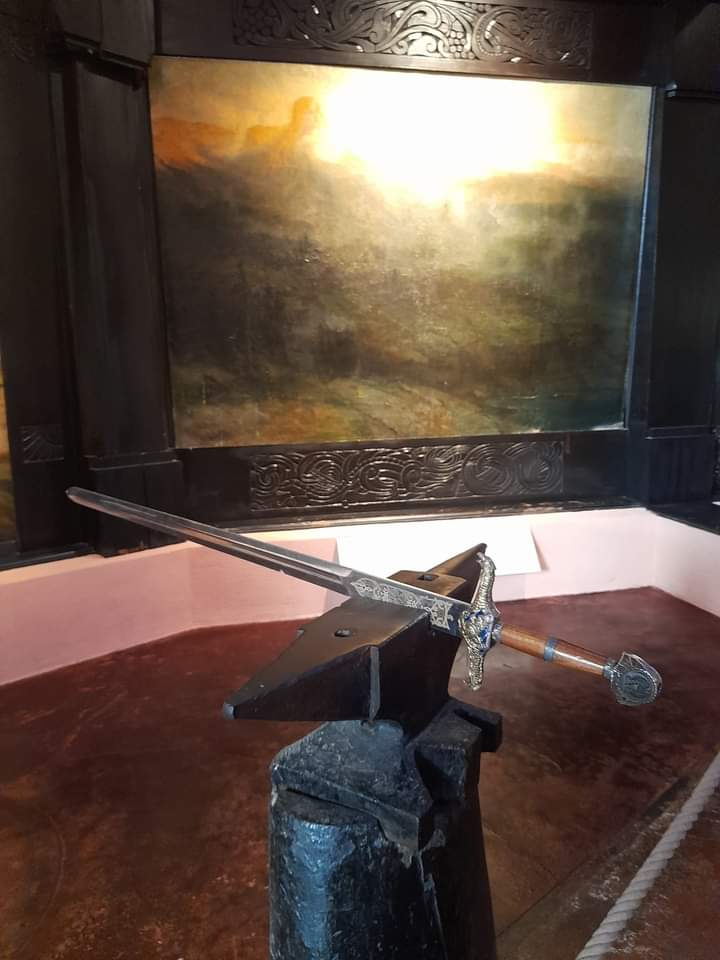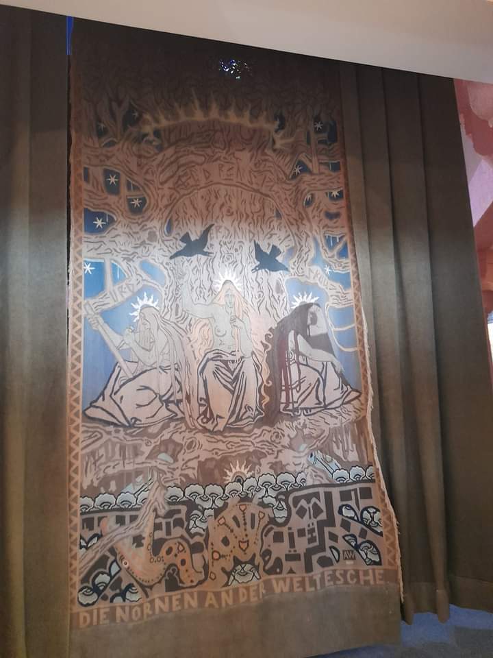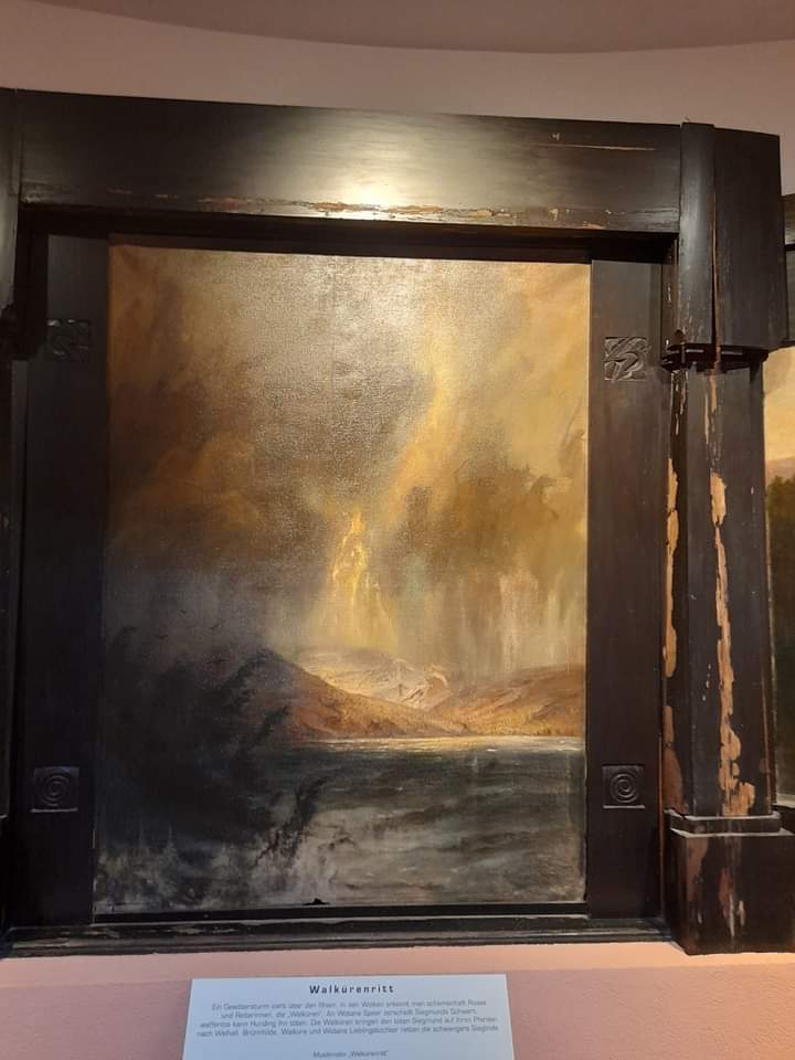 Die Atmosphäre im Saal ist bezaubernd, untermalt von Wagners Klängen. Beim Betreten des Saals sehen wir zur linken Seite drei Bilder aus der ersten Oper „Rheingold“ , „Walhalla“, Freyas Garten“ und „Nibelheim“. In dem Boden davor ist das Symbol für das Element Luft eingelassen und deutet auf den Himmel hin.