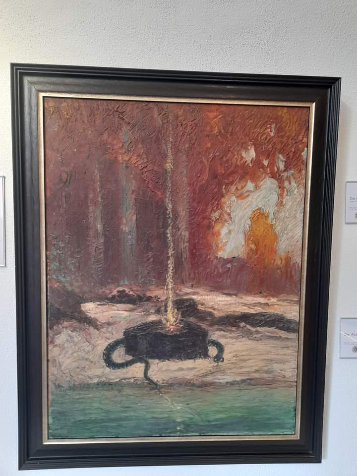 Weiter laufen wir im Uhrzeigersinn und entdecken die Nornen an der Weltesche, sodann „Siegfrieds Tod und schließlich die „Götterdämmerung“ . Wotan, begleitet von seinen Raben Hugin und Munin thront auf einem Felsen mit der zerbrochenen Lanze, Symbol seiner Macht. In der Ferne steht die Götterburg Walhall in Flammen, das ist das Ende der Götterwelt. Im Boden das Symbol Feuer.