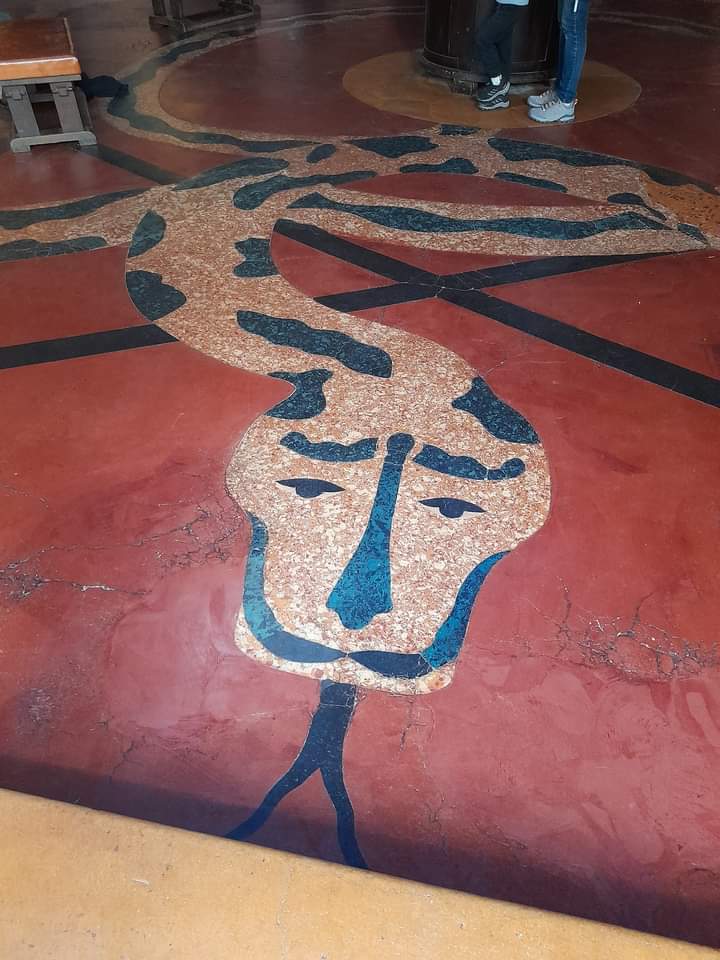 Zum Fußboden: Eine im Zentrum gelegene Erdscheibe wird von einem großen Hexagramm eingeschlossen, durch dessen Spitzen sich die Midgardschlange 60 Meter weit windet. Das Hexagramm wird aus zwei Dreiecken gebildet , den alten Symbolen für Wasser und Feuer.