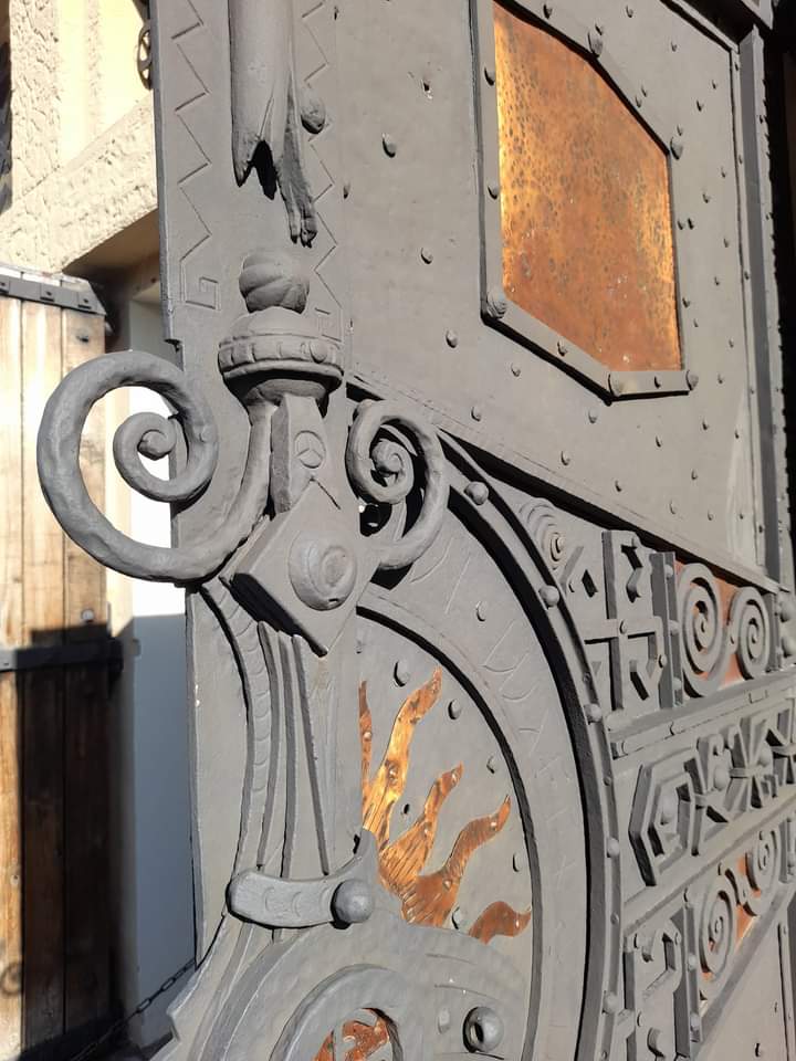 Die Eingangsflügeltür mit Inschriften, verweist auf den Bau, seinen Mentor und Anlass.