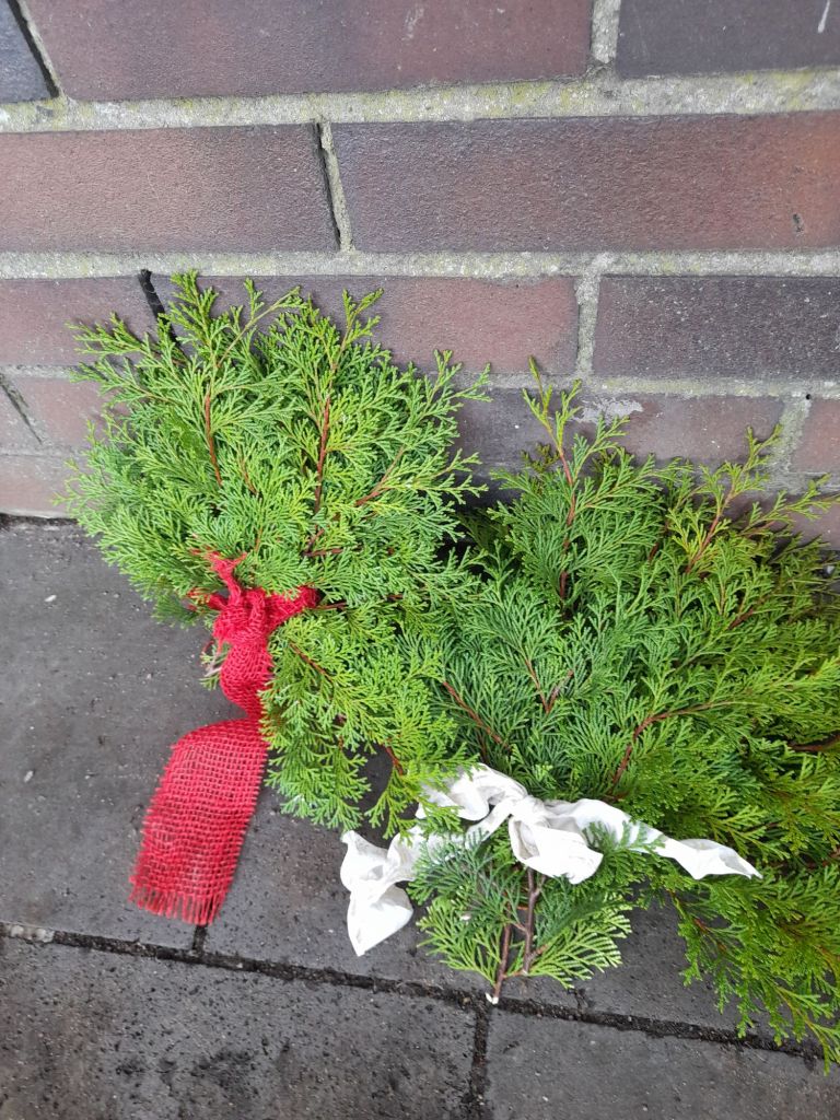 Wir haben zwei Bündel mit Zweigen vom Lebensbäumchen mit einer Schleife versehen und am Denkmal niedergelegt. Niemand war hier. Lediglich eine Kerze entdeckten wir in einer Ecke dieser Gedenkstätte, um die sich offensichtlich keiner schert.