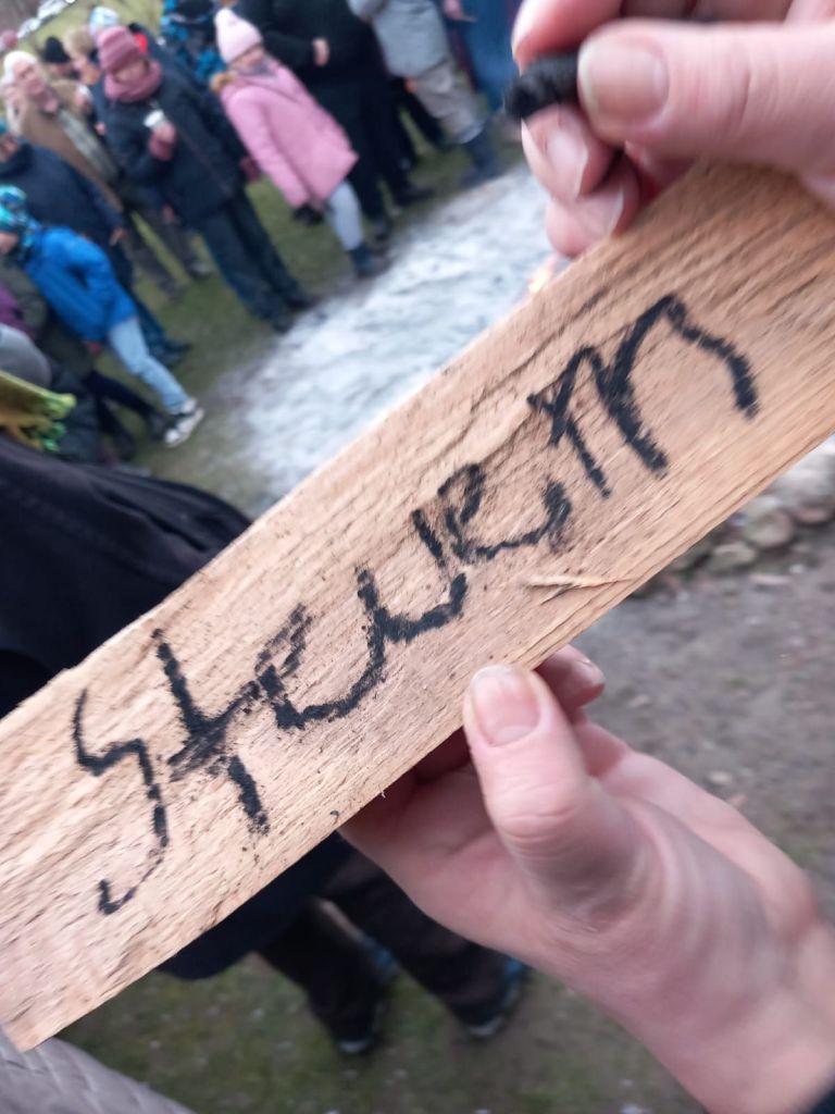 Und so geht es weiter: Zunächst mit unseren Wünschen zur ersten Raunacht., aber auch mit der Möglichkeit unseren Ballast, das was uns besonders belastet, loszulassen. Dazu bekamen wir ein Scheit Holz und Kohle zum draufschreiben. Was soll man sagen, in Tagen wie heute: Da fand sich einiges Interessantes an Ballast “ im Feuer…
