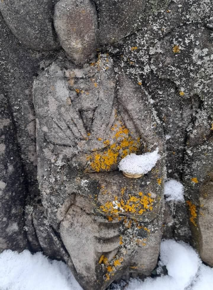 Bis heute besuchen die Menschen diesen Kultplatz und legen ihre Gaben nieder. Der Weg war im Schneegestöber schon recht beschwerlich. Doch schließlich war es ein ganz besonderer Moment, als wir dann bei den Göttinnen am Heidentempel eintrafen.